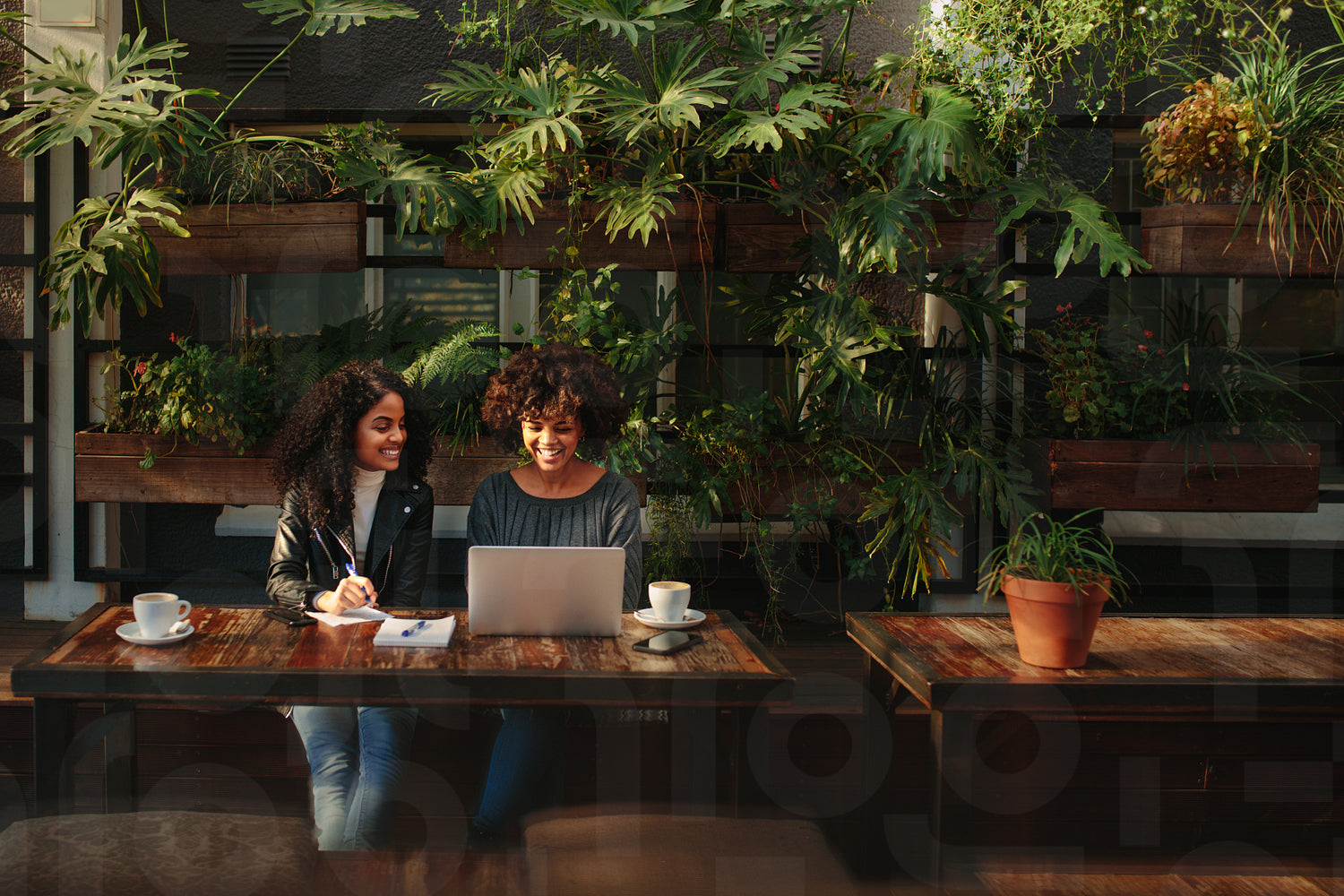 Two women sitting with a laptop and notepads at a coffee table. Business colleagues working while having coffee at a coffee shop.