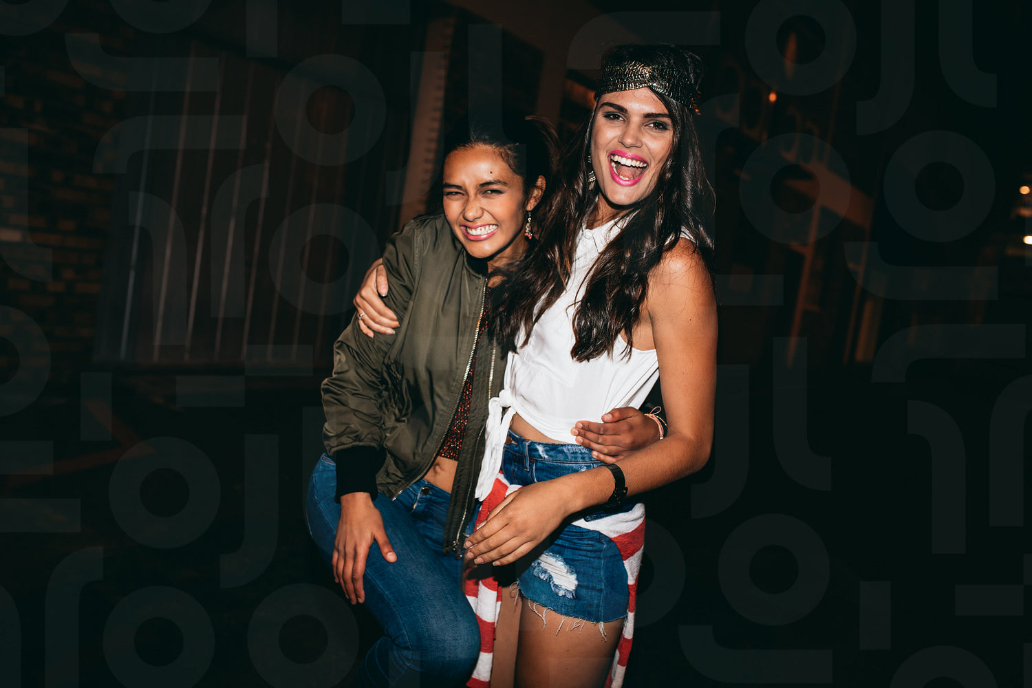 Portrait of two young female friends having fun outdoors. Women enjoying in outdoor party in evening.
