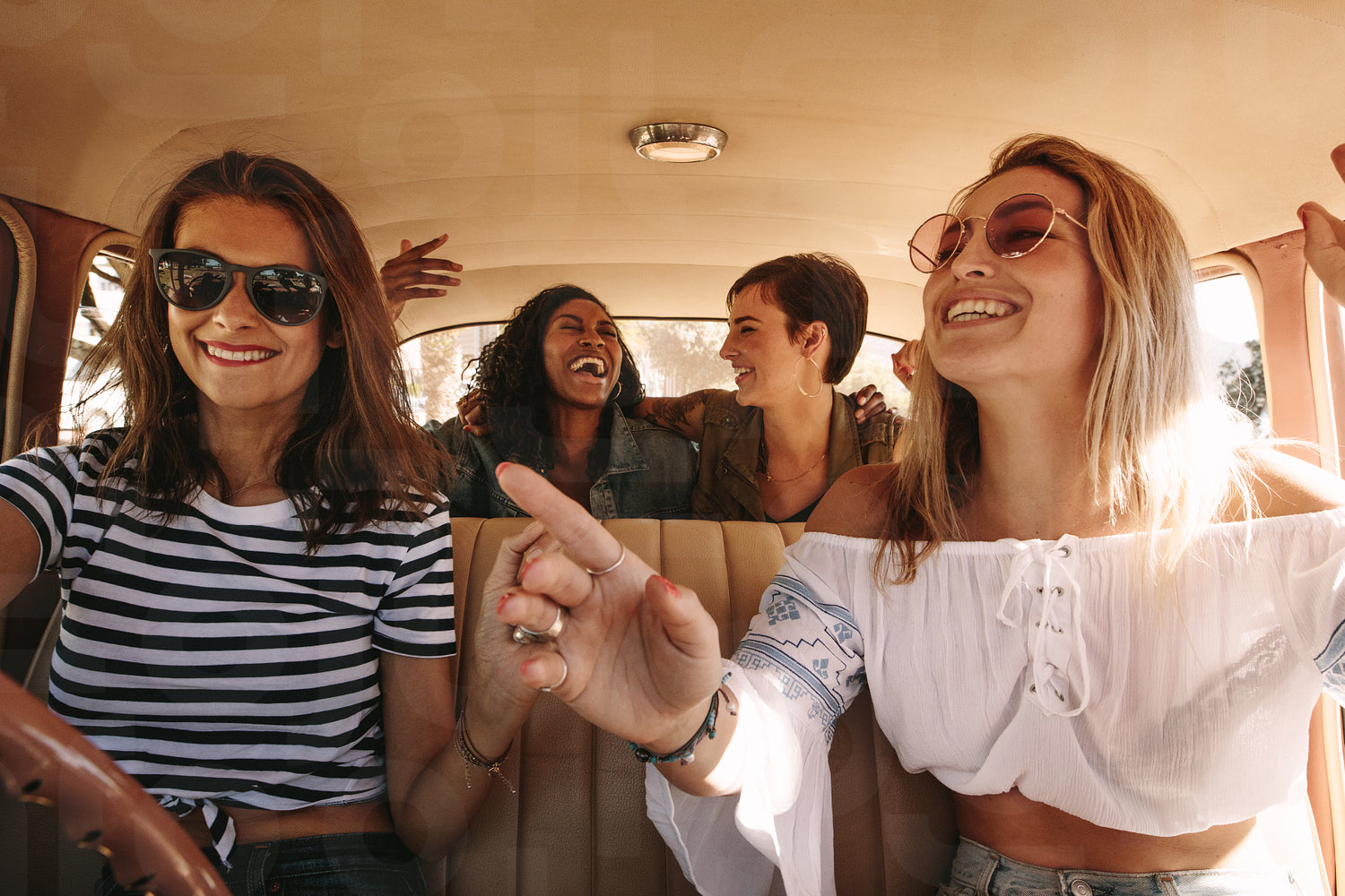 Young females on a road trip traveling by a car and laughing. Group of mixed race women having fun on a road trip.