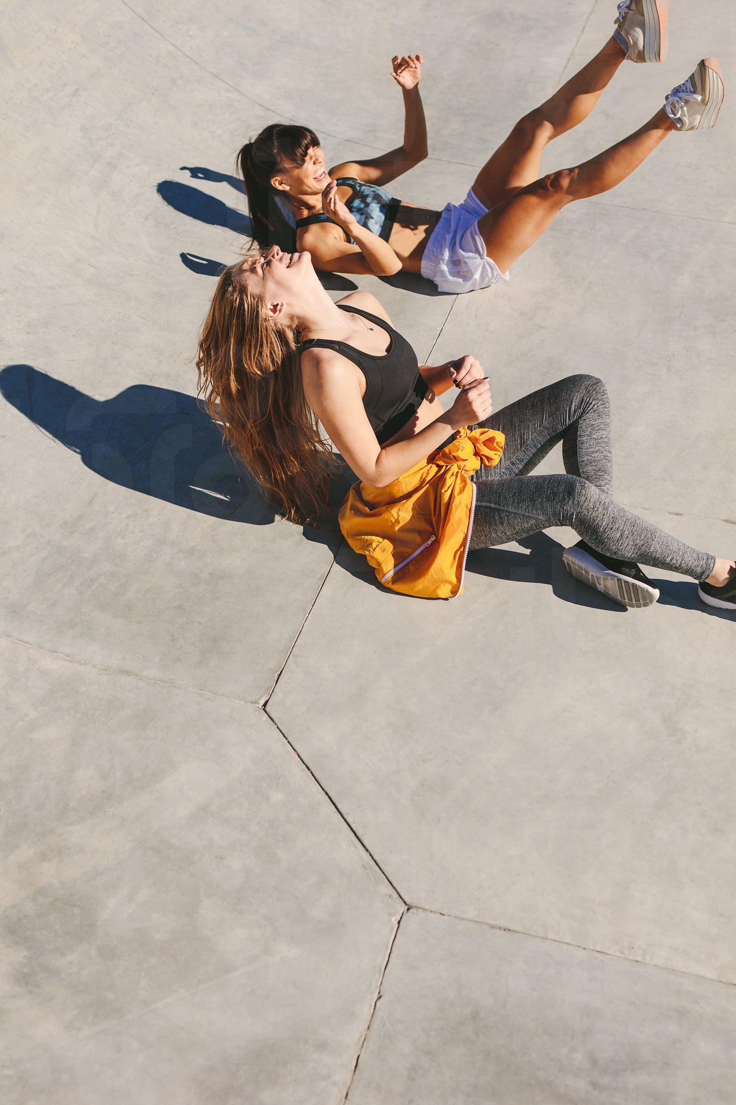 Two girls smiling after sliding down at skate park. Women friends having fun at skate park.