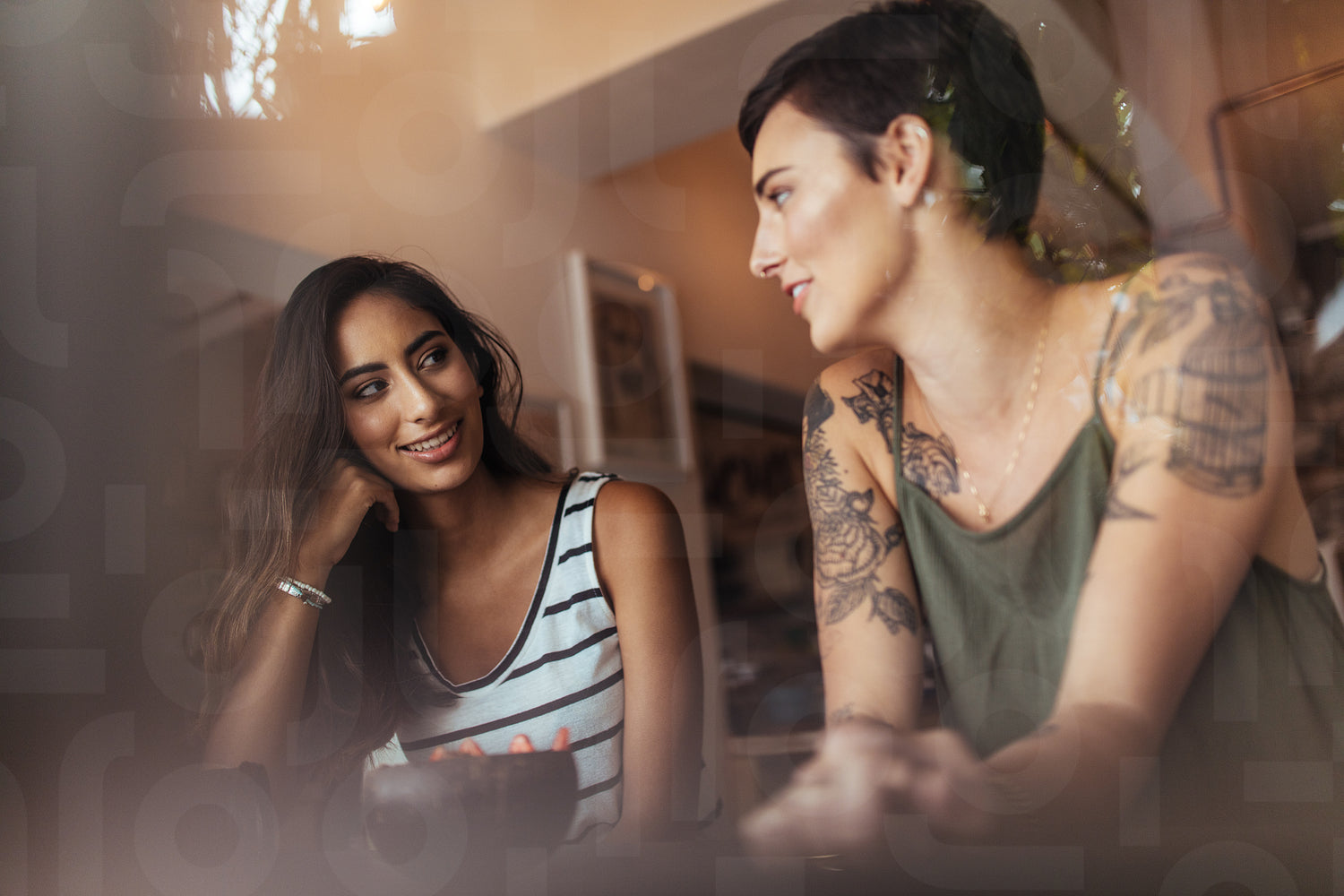 Friends talking while sitting at home with a fruit bowl on the table. Two women bloggers sharing ideas on flood blogging.