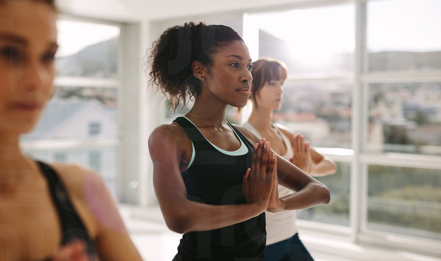 Women stretching and practices yoga in class. Healthy female doing yoga workout in fitness studio. Standing with hands joined.