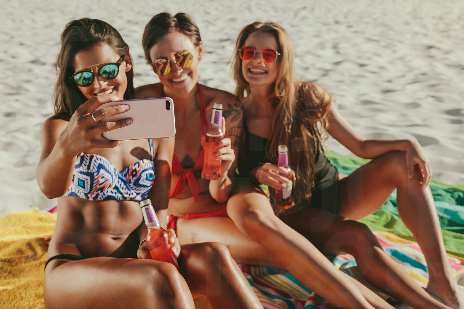 Three girlfriends in bikini sitting at a beach holding drinks and taking a selfie. Women on vacation at a beach posing for a selfie wearing sunglasses.