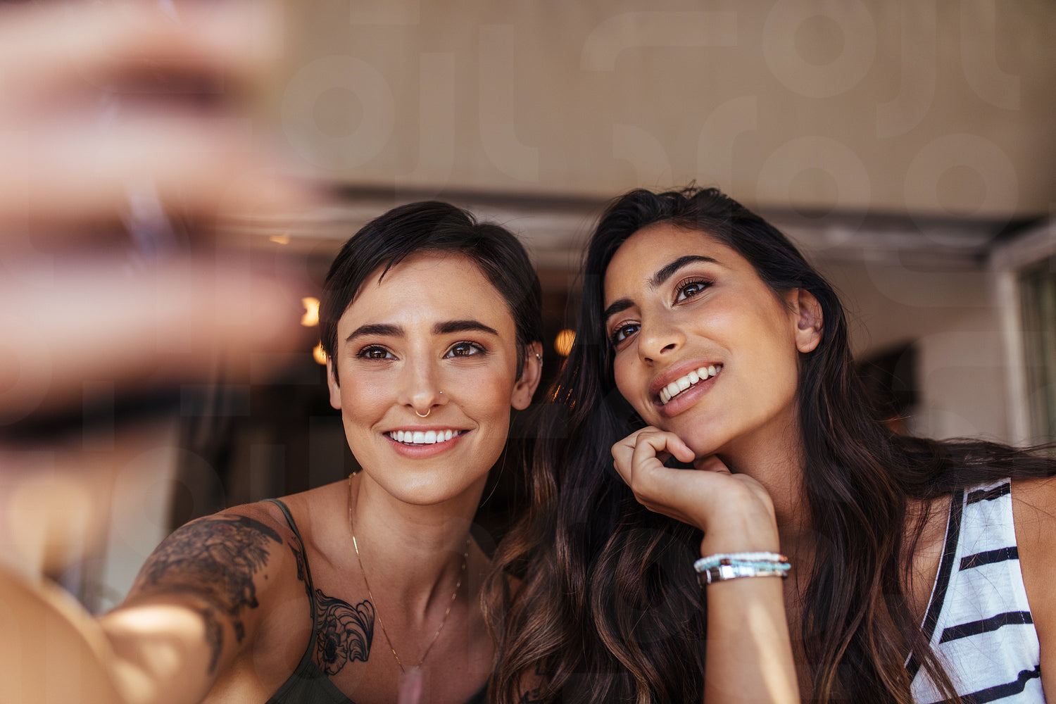 Two women sitting outdoors looking at a mobile phone. Smiling women posing for a selfie.