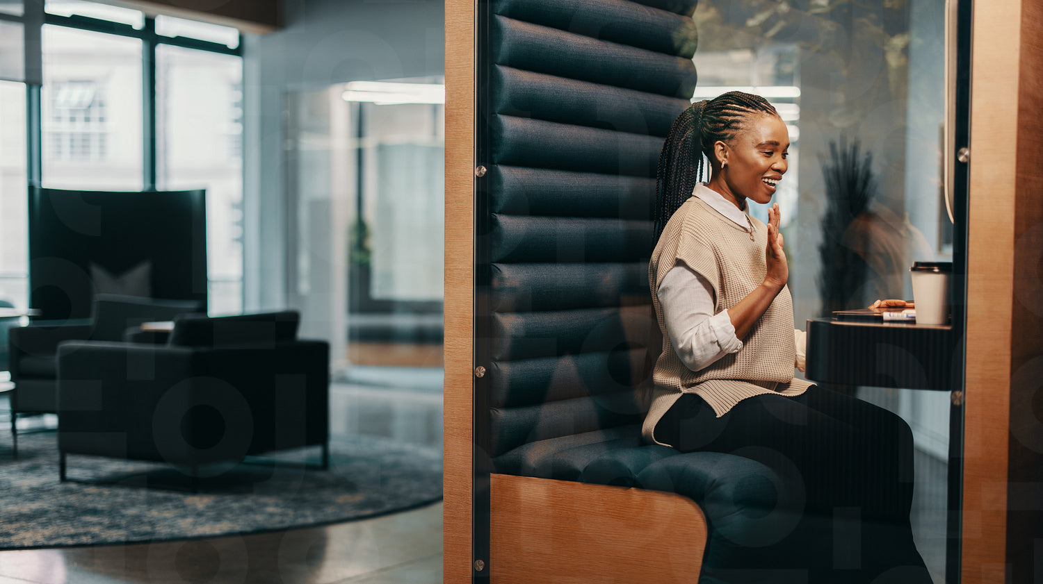 Successful young African business woman working in a coworking office. She is sitting, smiling, and talking on a video call. She demonstrates remote work and virtual communication in a professional environment.