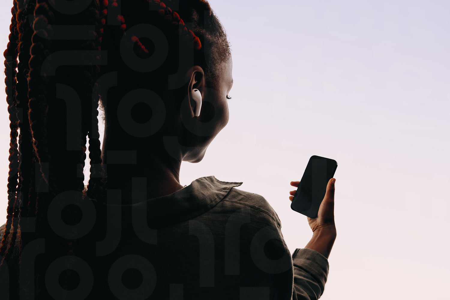 Rearview of a young woman with braided ponytail hair holding a smartphone and wearing earbuds, engaged in a video call. Gen Z woman embracing a lifestyle of connectivity and technology usage.
