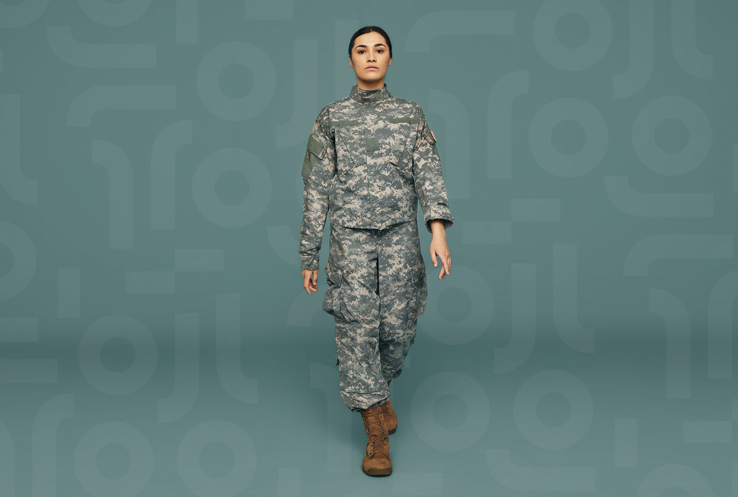 Young American servicewoman marching towards the camera in a studio. Courageous young soldier wearing the camouflage uniform of the United States Armed Forces.