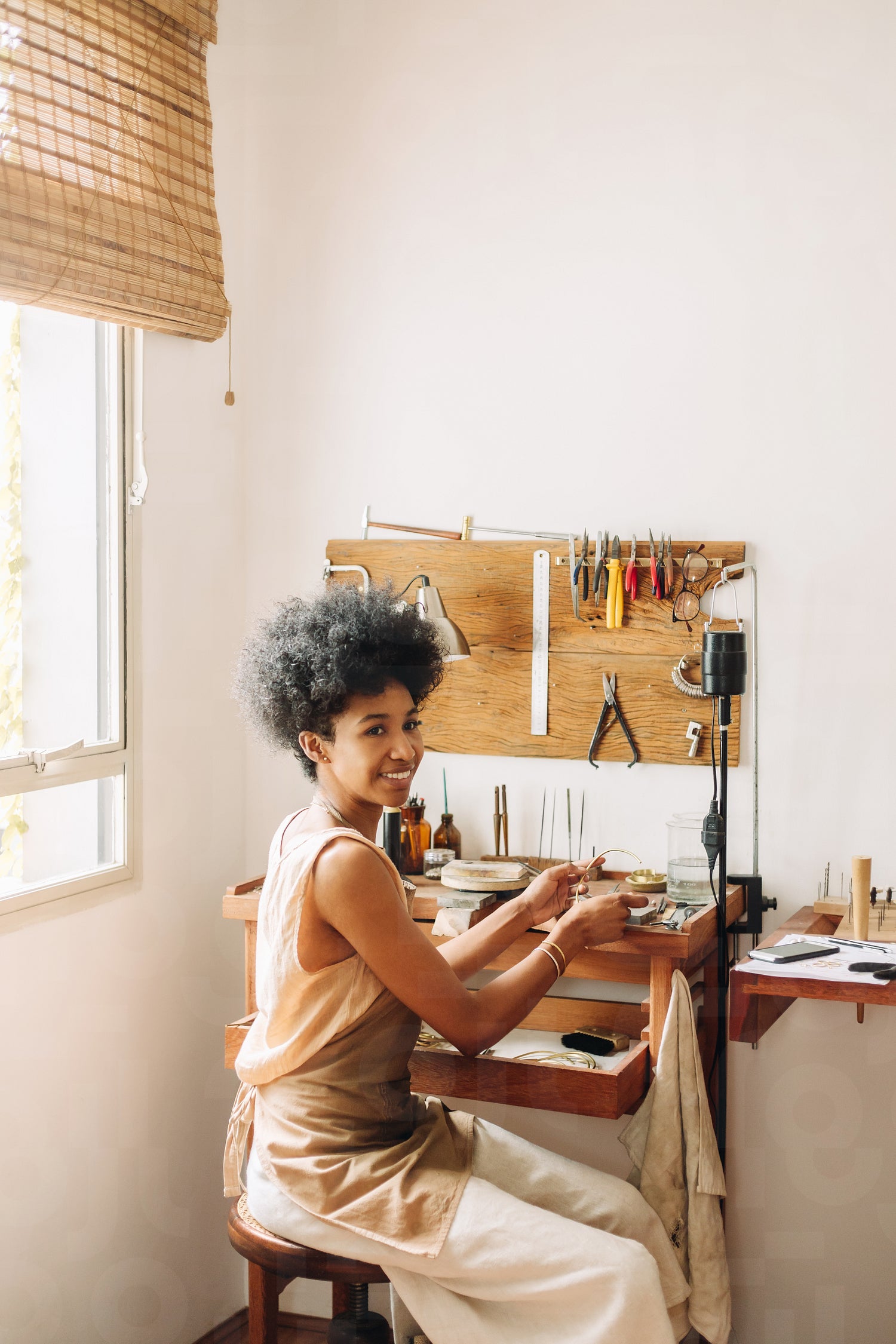 Young artist glancing back while doing her work on jewelry. Woman in her studio giving the final touch to her jewelry designs.