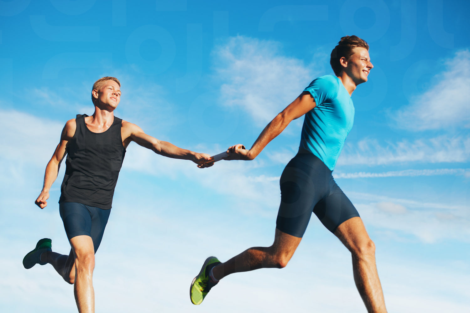 Portrait of young athletes pass the baton in a track relay against sky. Young runner practicing a relay race.