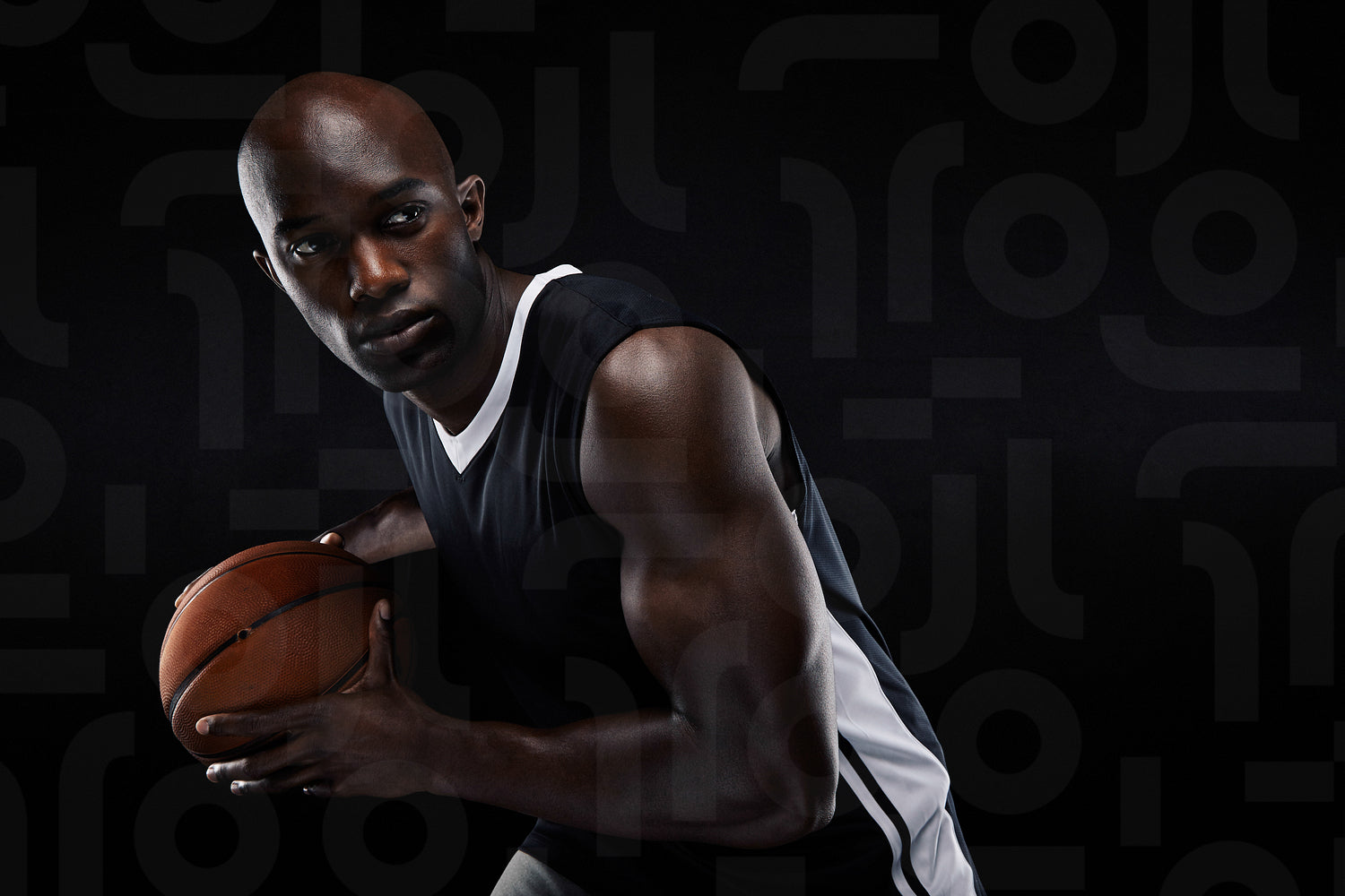 Portrait of fit young male athlete playing basketball looking at copyspace. African american basketball player against black background