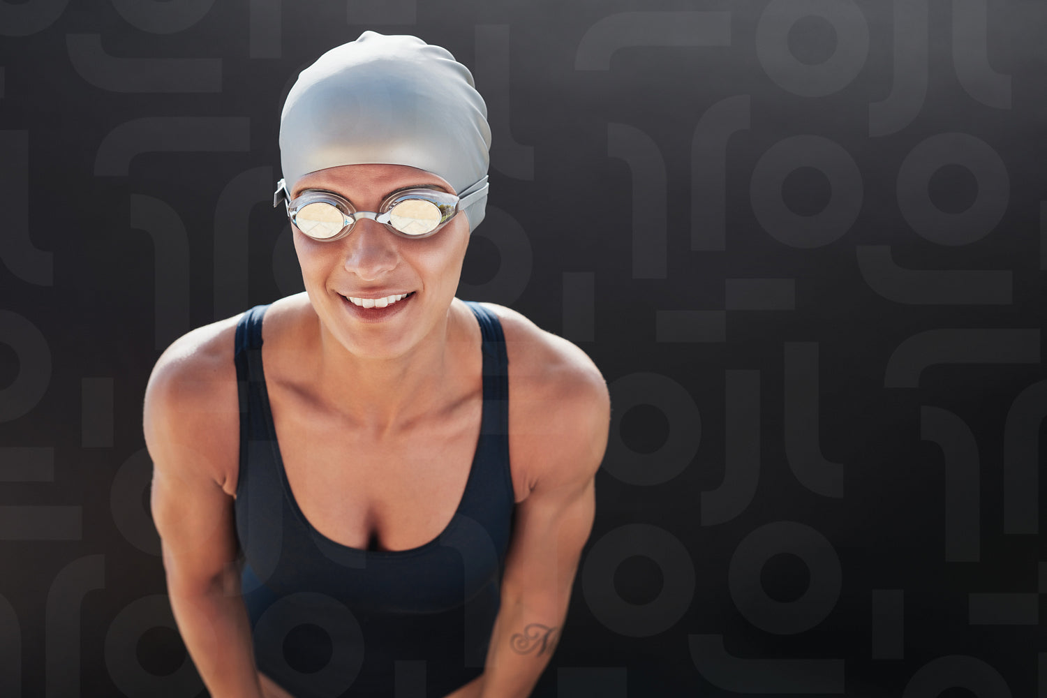 Young beautiful sportswoman in swimsuit with swimming goggles looking at camera on black background