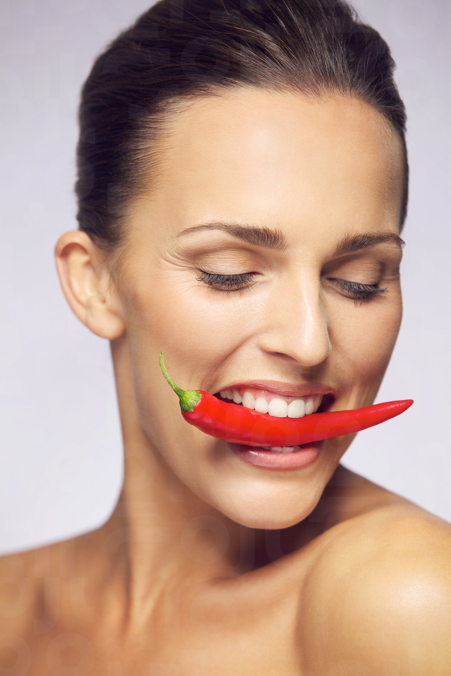 Beautiful young woman holding chili pepper between her teeth against gray background. Studio shot of pretty caucasian woman biting hot chili pepper
