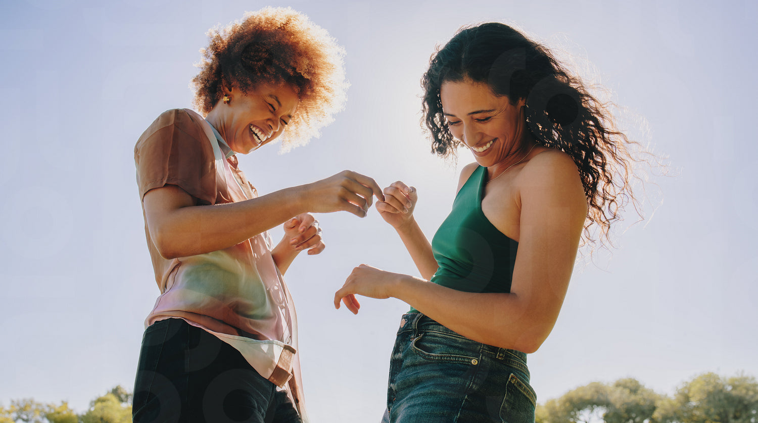 Young best friends having fun outdoors, sharing laughter and joy under a clear blue sky. Enjoying moments of happiness and connection.