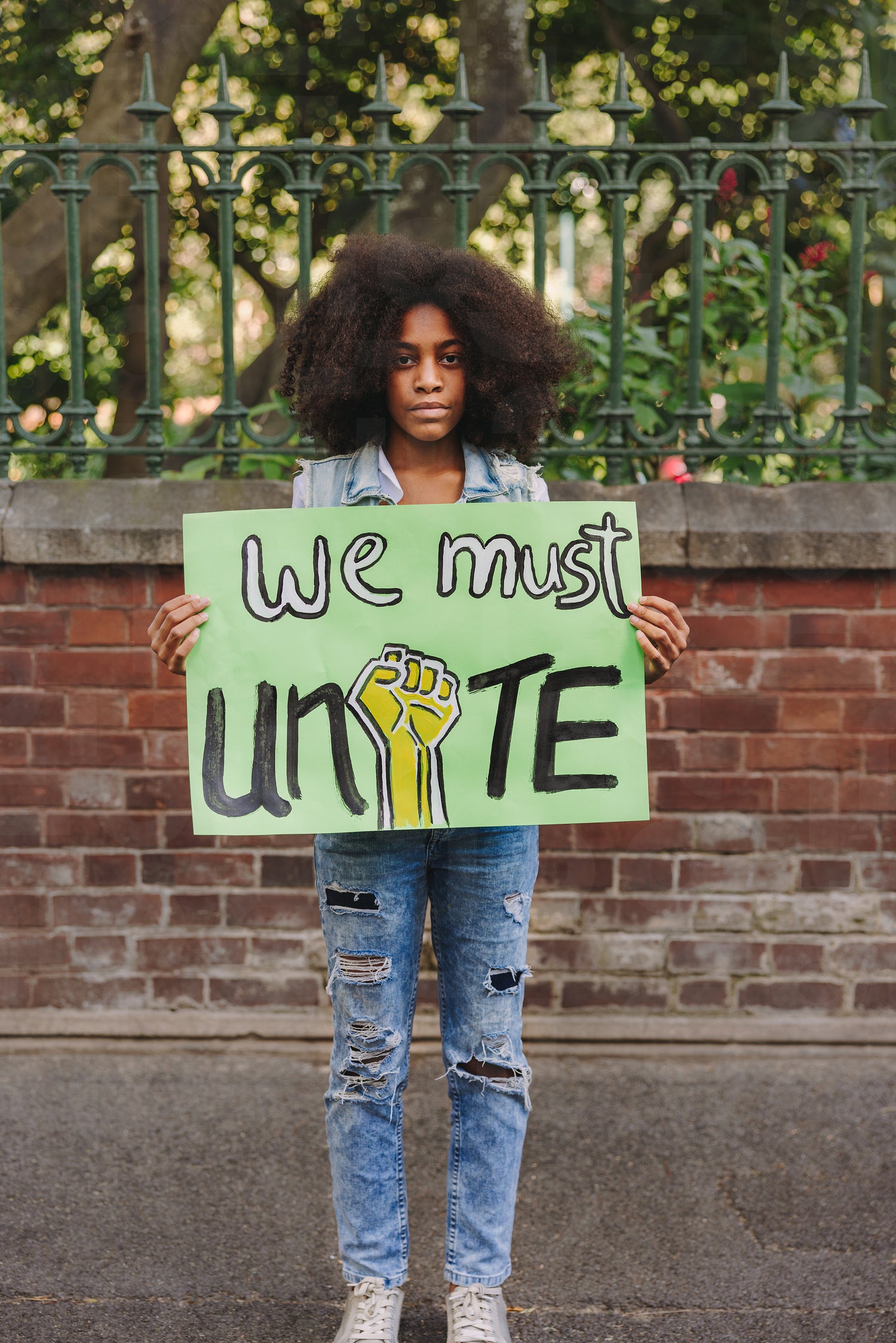 Young black girl looking at the camera while holding a poster calling for unity. Teenage activist protesting against racial inequality and discrimination.