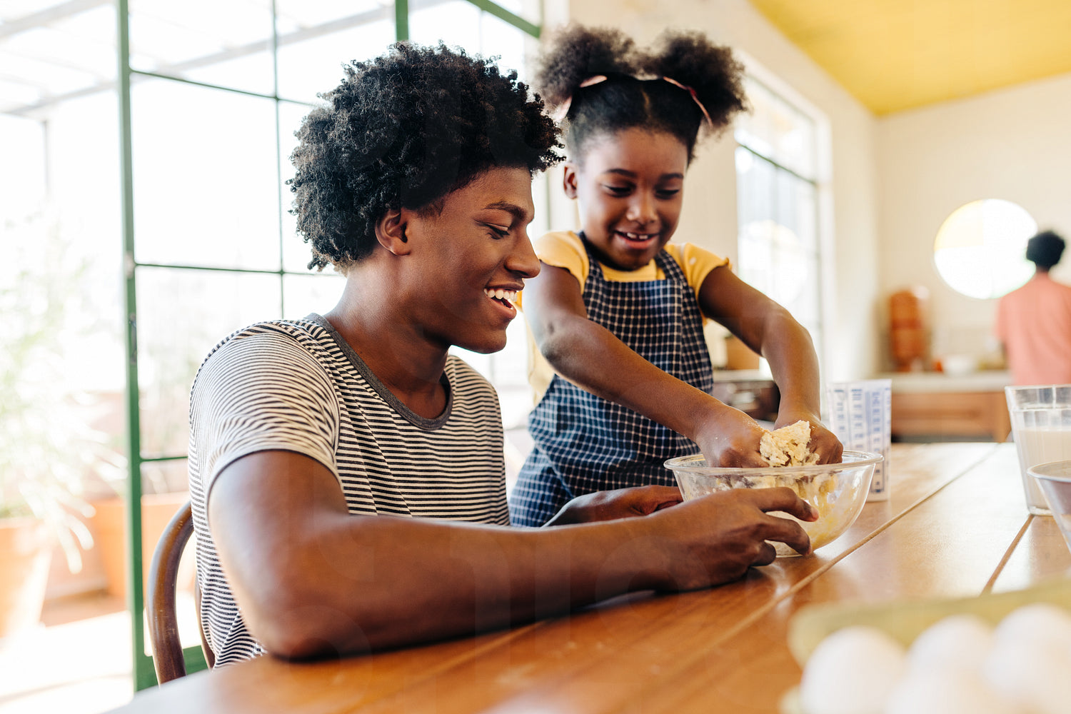 Brazilian girl happily mixing the ingredients for a bolo de fubá recipe, kneading the dough with her hands. Siblings enjoying family baking time, preparing a traditional cornmeal cake together at home.