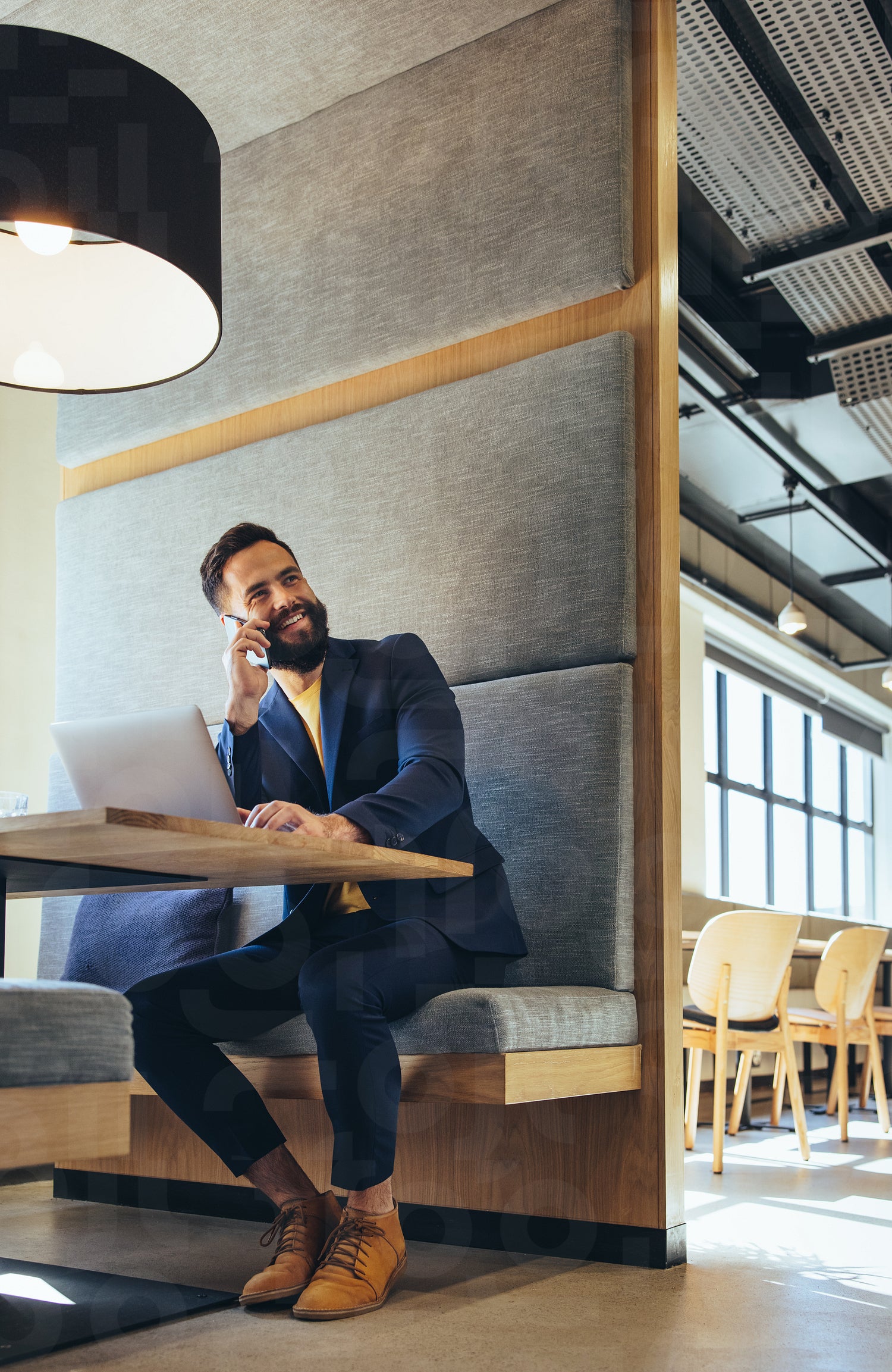 Young businessman speaking on a phone call. Happy young businessman smiling while communicating with his business partners. Successful entrepreneur working in a modern workspace.