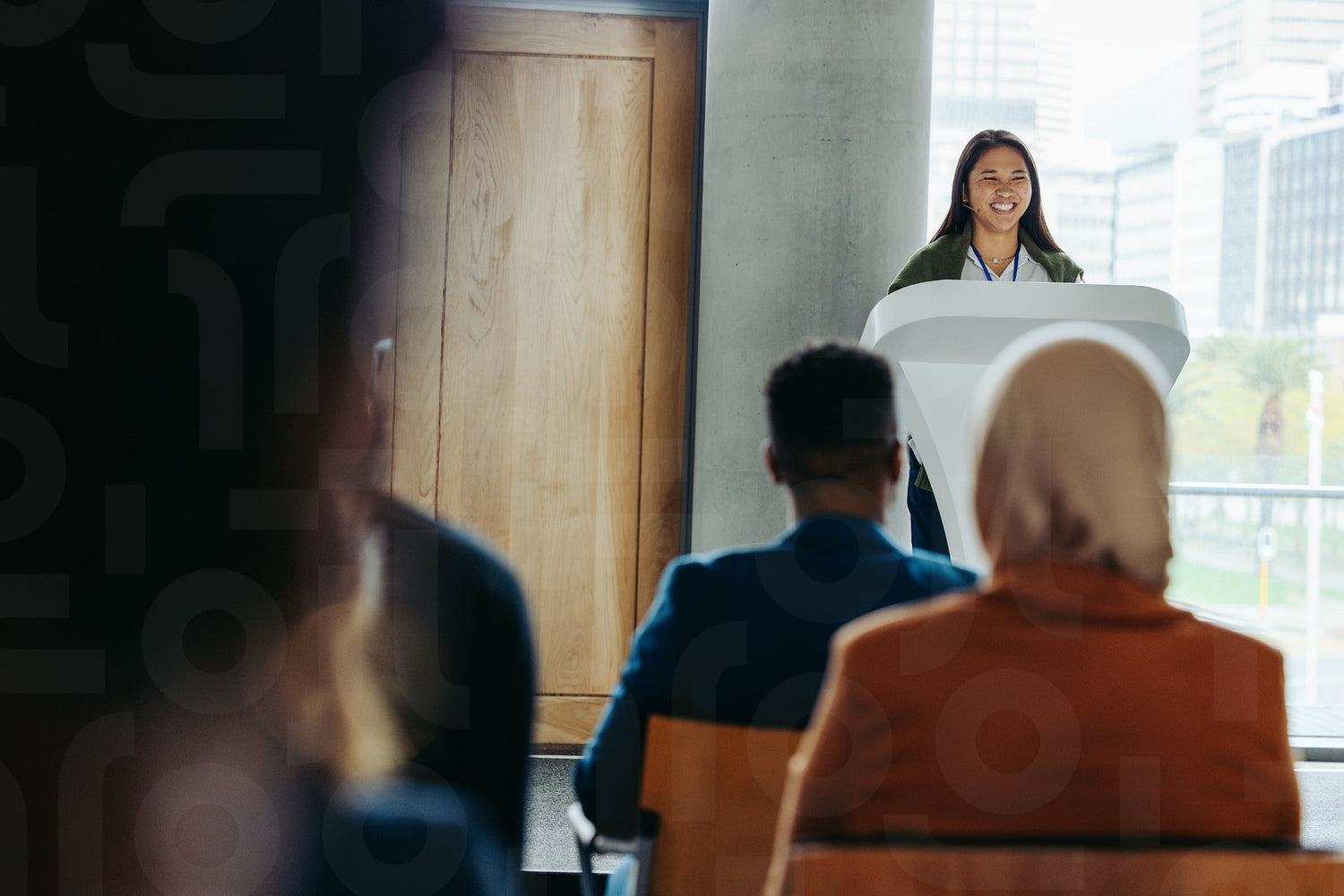 Young businesswoman speaking at a conference, giving a presentation to a diverse audience in a modern workshop setting