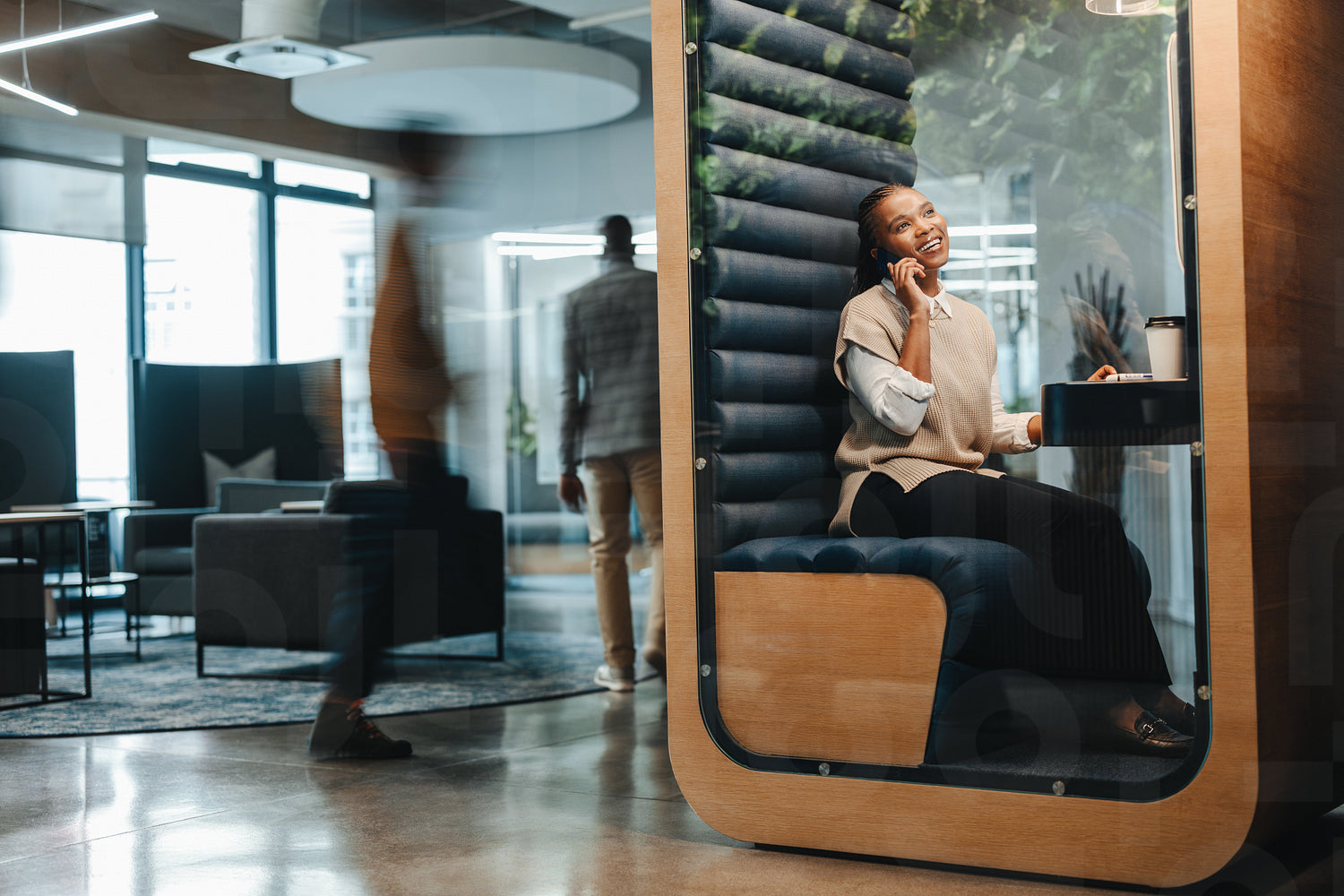 Young businesswoman speaking on smartphone , sitting inside a booth in a coworking space