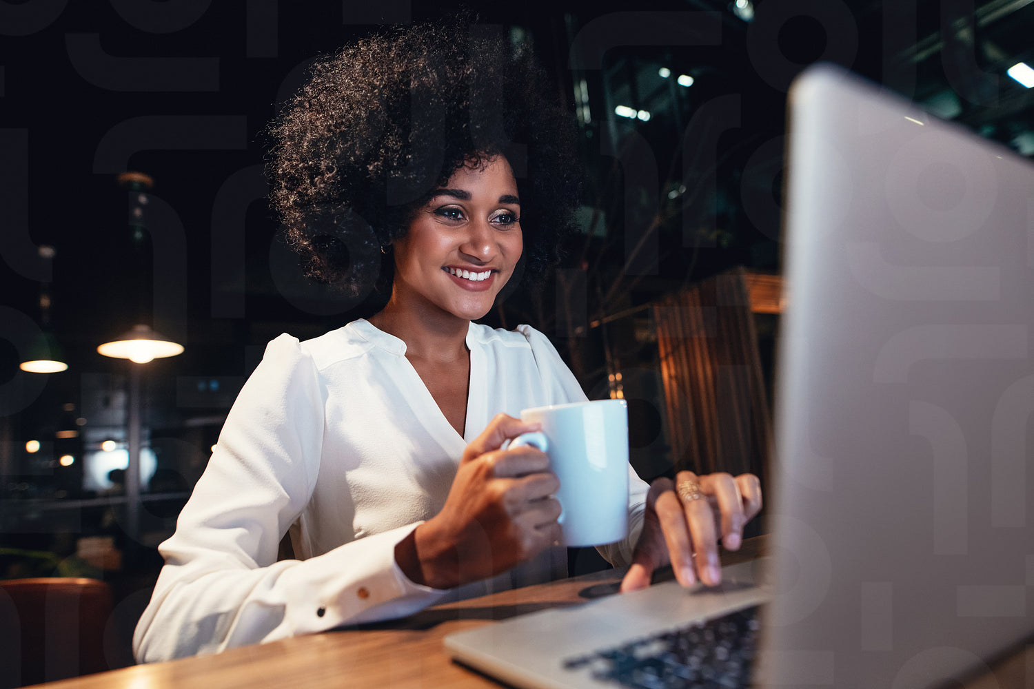 Young businesswoman working on the laptop at late night shift. happy woman at desk holding cup of coffee and looking at laptop.