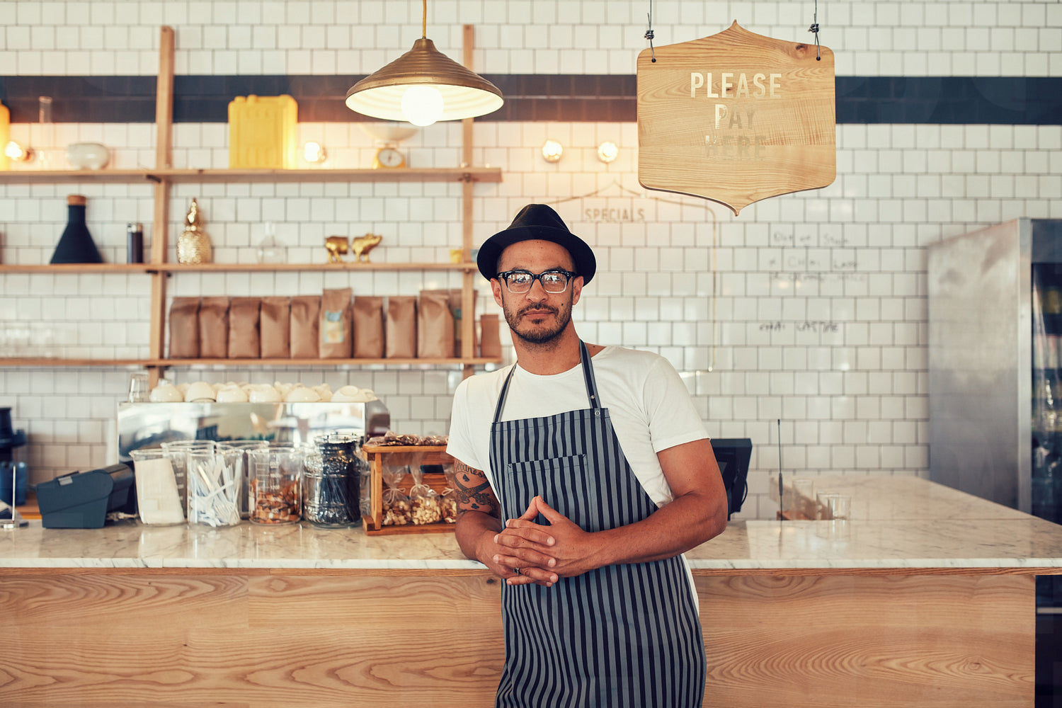 Portrait of a confident young coffee shop owner standing at the cafe counter. Handsome young man working at a restaurant and wearing an apron and hat.