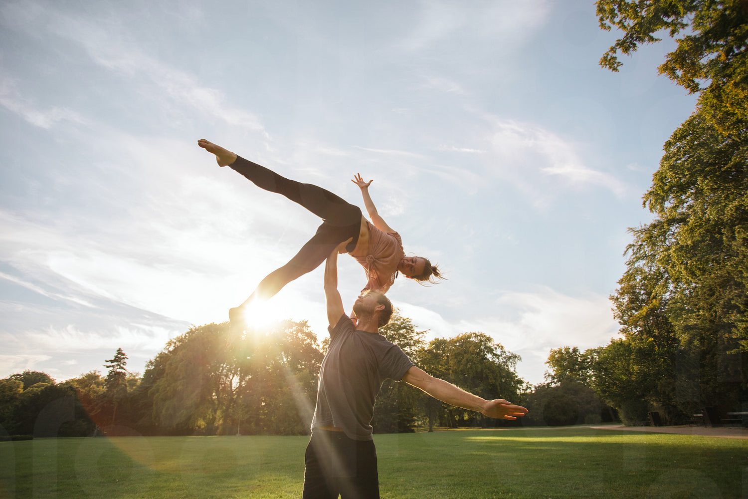 Shot of young couple doing acroyoga. Young man lifting and balancing woman on his hand at the park.