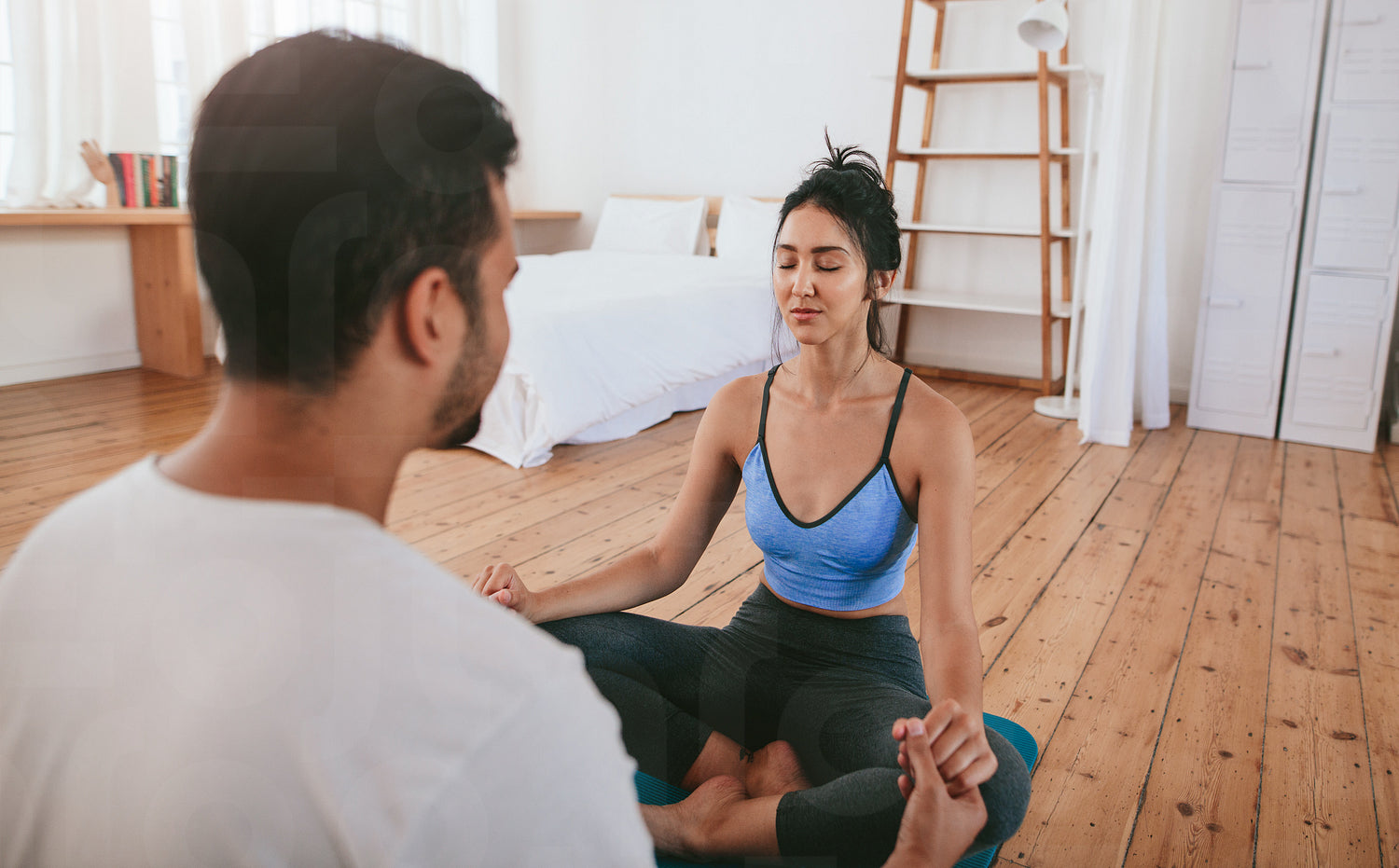 Beautiful young woman doing yoga at home with her instructor. Young couple sitting together holding hands and practising yoga.