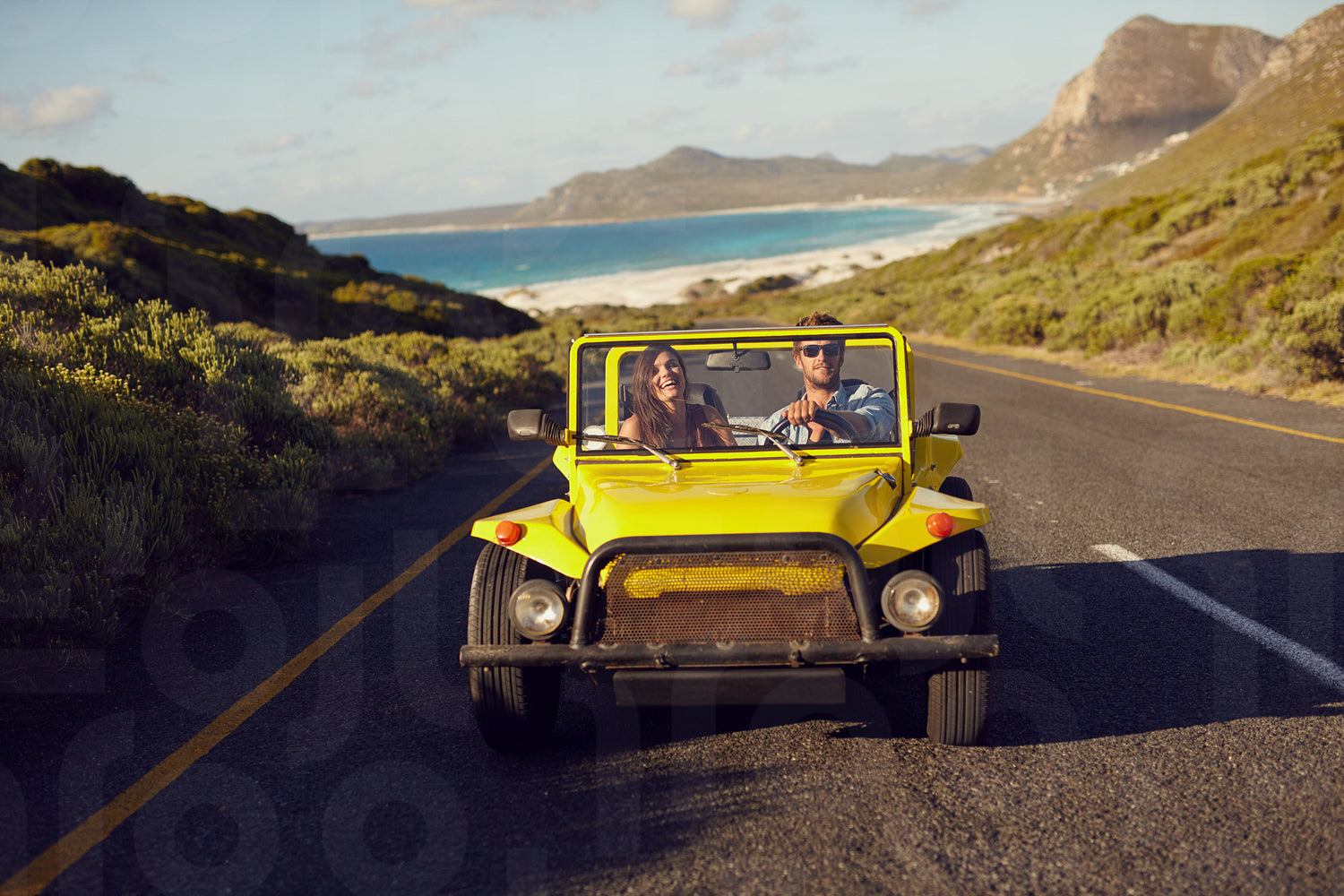 Outdoor shot of young couple driving car in nature. Young man and woman enjoying road trip in a buggy car.