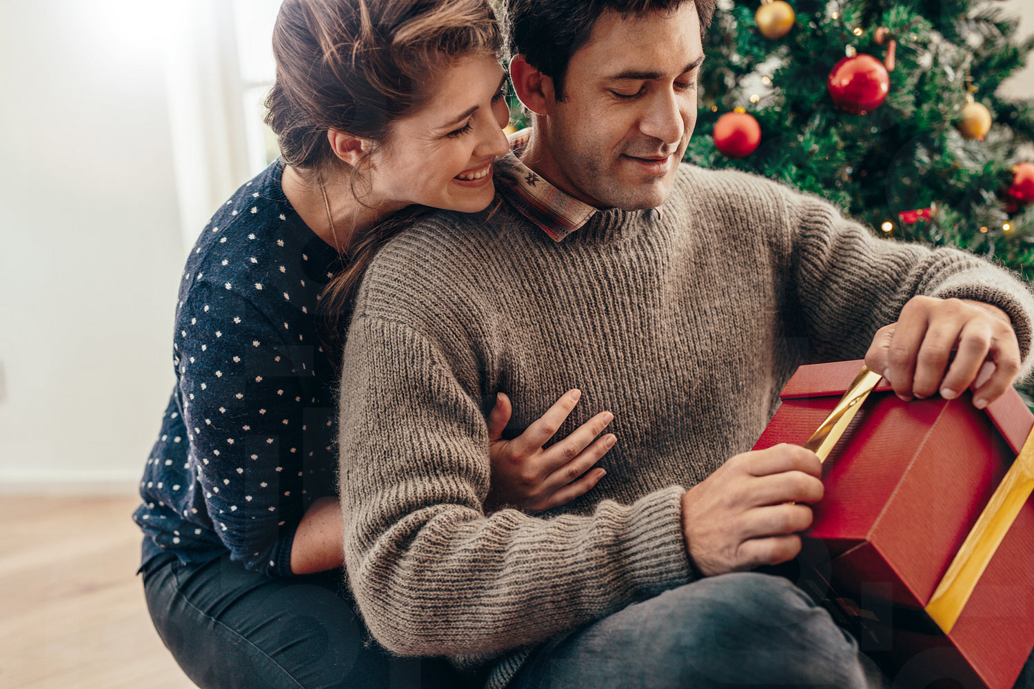 Young man opening Christmas gift. Smiling woman holding her partner from behind while spending happy moments celebrating Christmas.