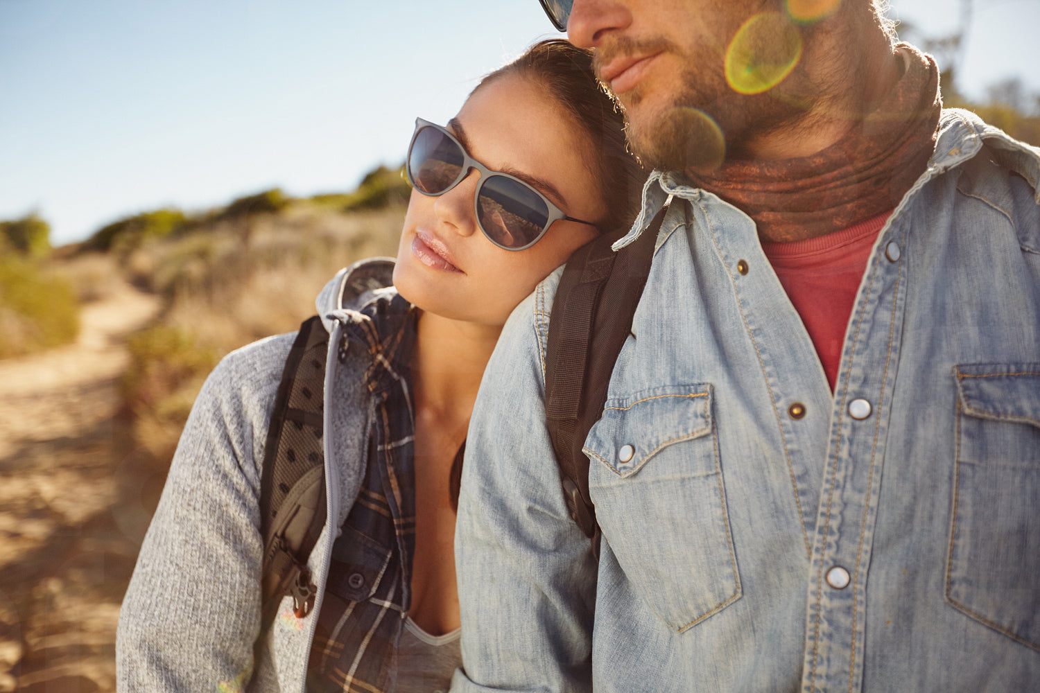 Close up portrait of young couple in love outdoors on a country hike. Young woman leaning on shoulder of her boyfriend. Caucasian couple hiking in nature.