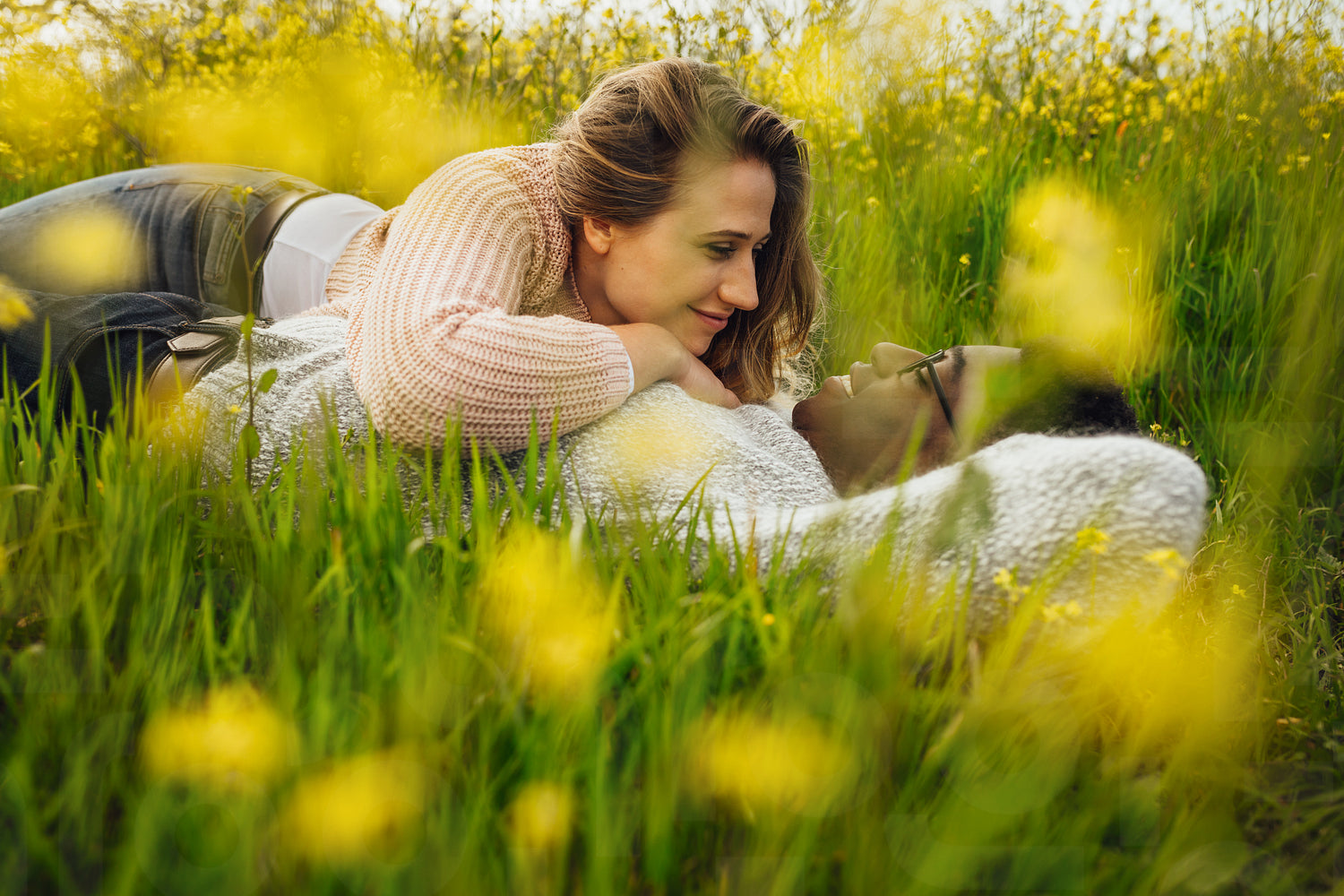 Beautiful woman lying with her boyfriend on the high grass. Young couple lying on the grass in meadow.