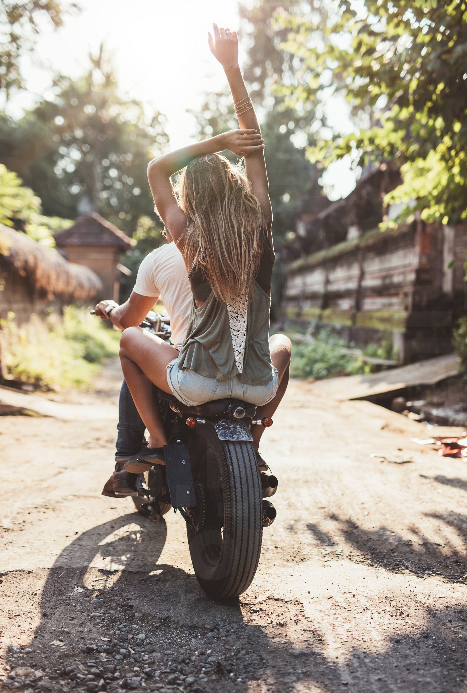 Rear view shot of young couple riding motorcycle on rural road. Young female sitting on back of her boyfriend riding bike.
