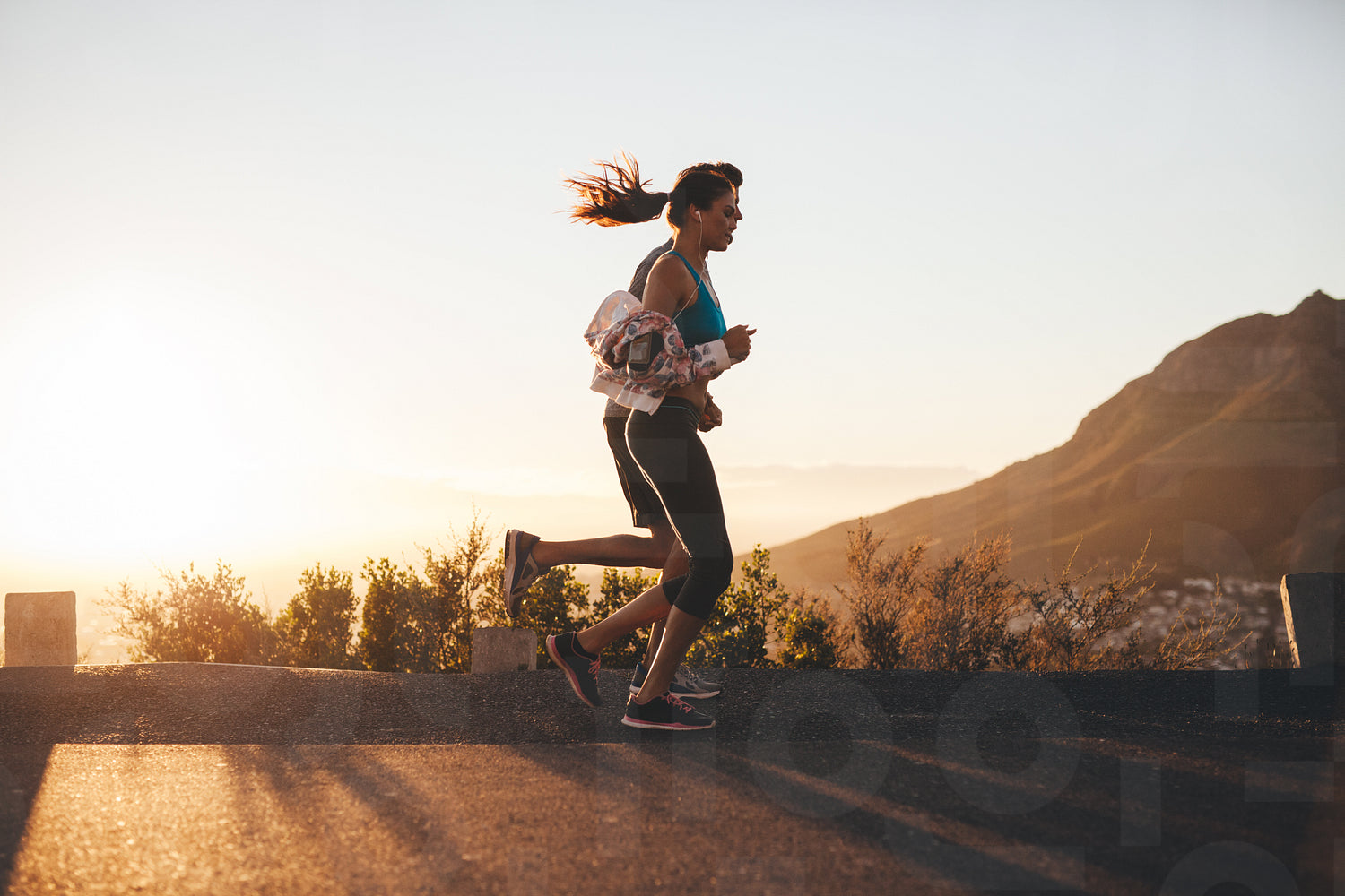 Image of young runners running together in morning. Two people jogging on a country road at sunrise.