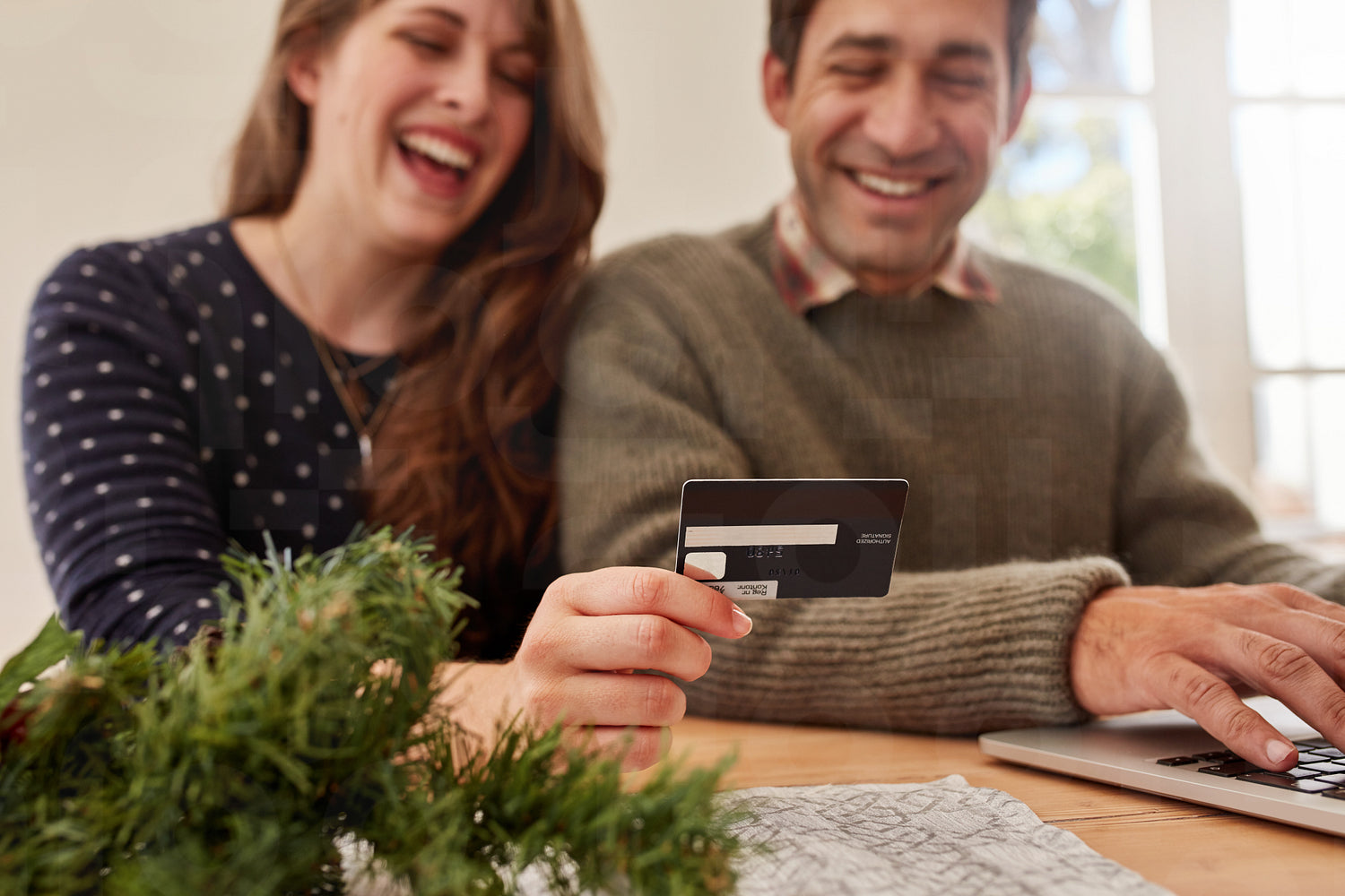 Young couple shopping online with credit card at home for Christmas, focus on credit card. Man using laptop and woman holding credit card.