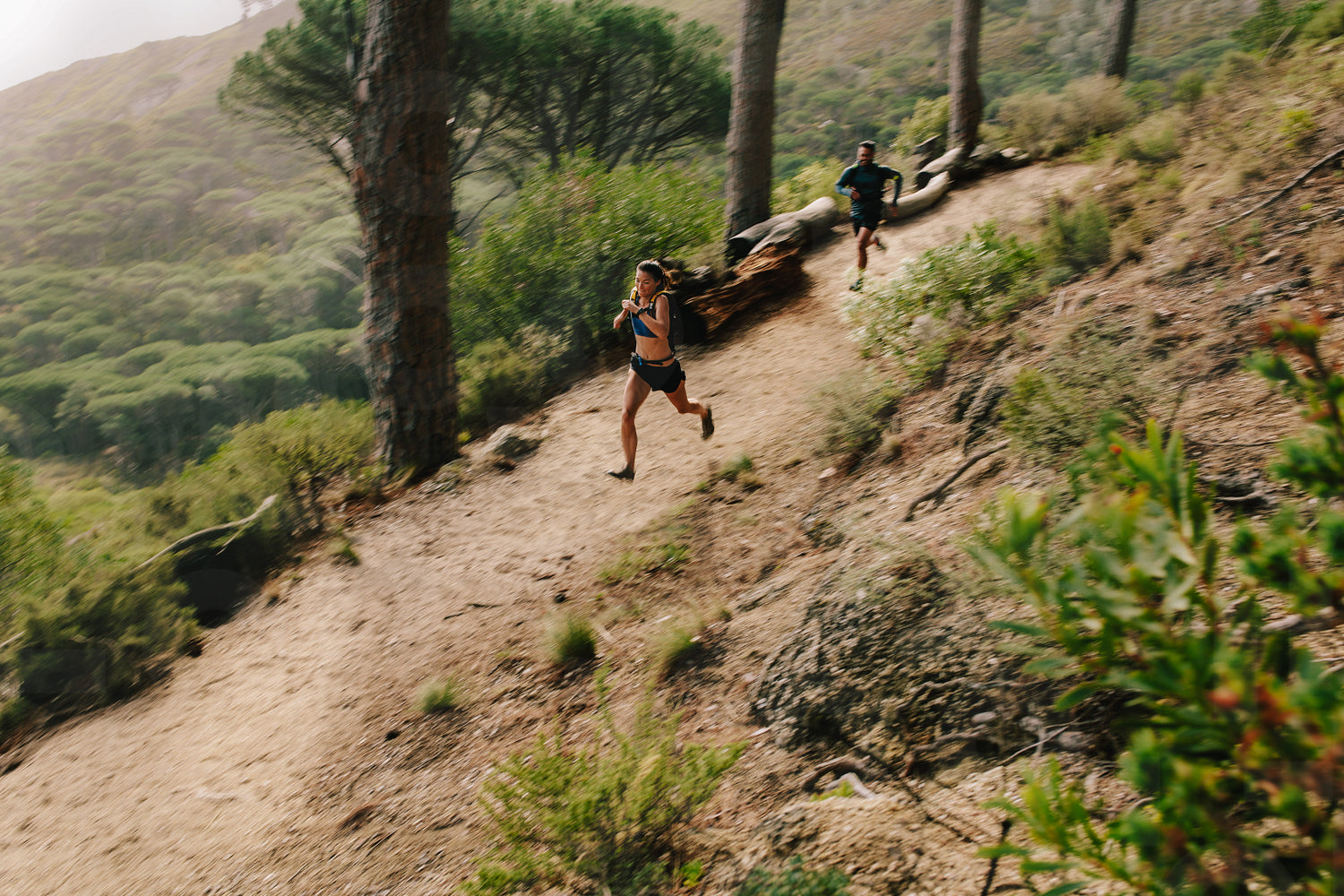 Young couple trail running on a mountain path. Runners working out in beautiful nature.