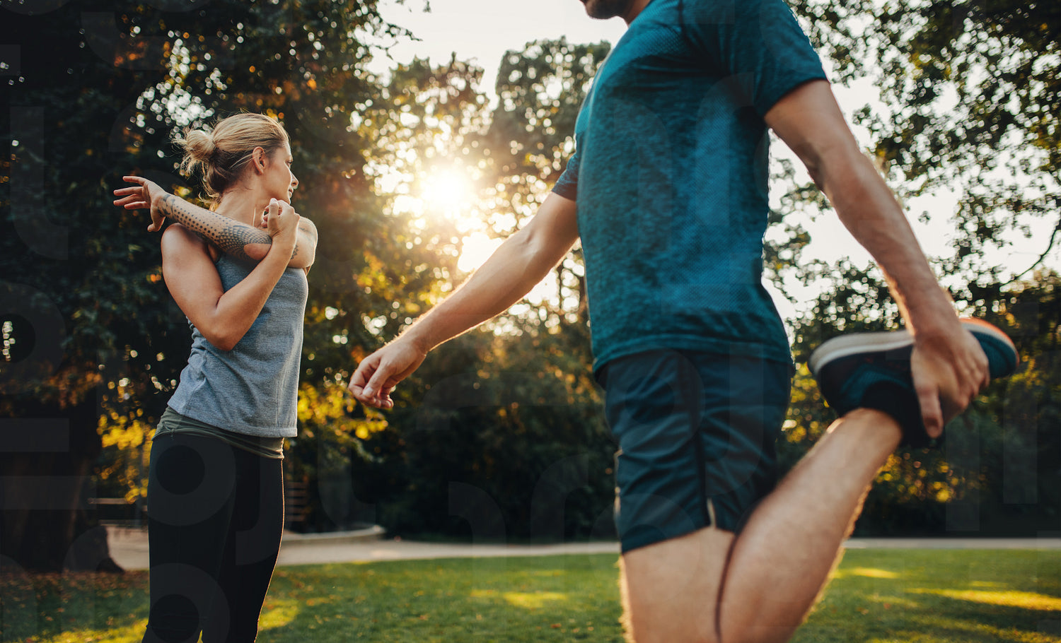 Shot of young man and woman doing stretching exercise in the park. Young couple warming up for morning workout.