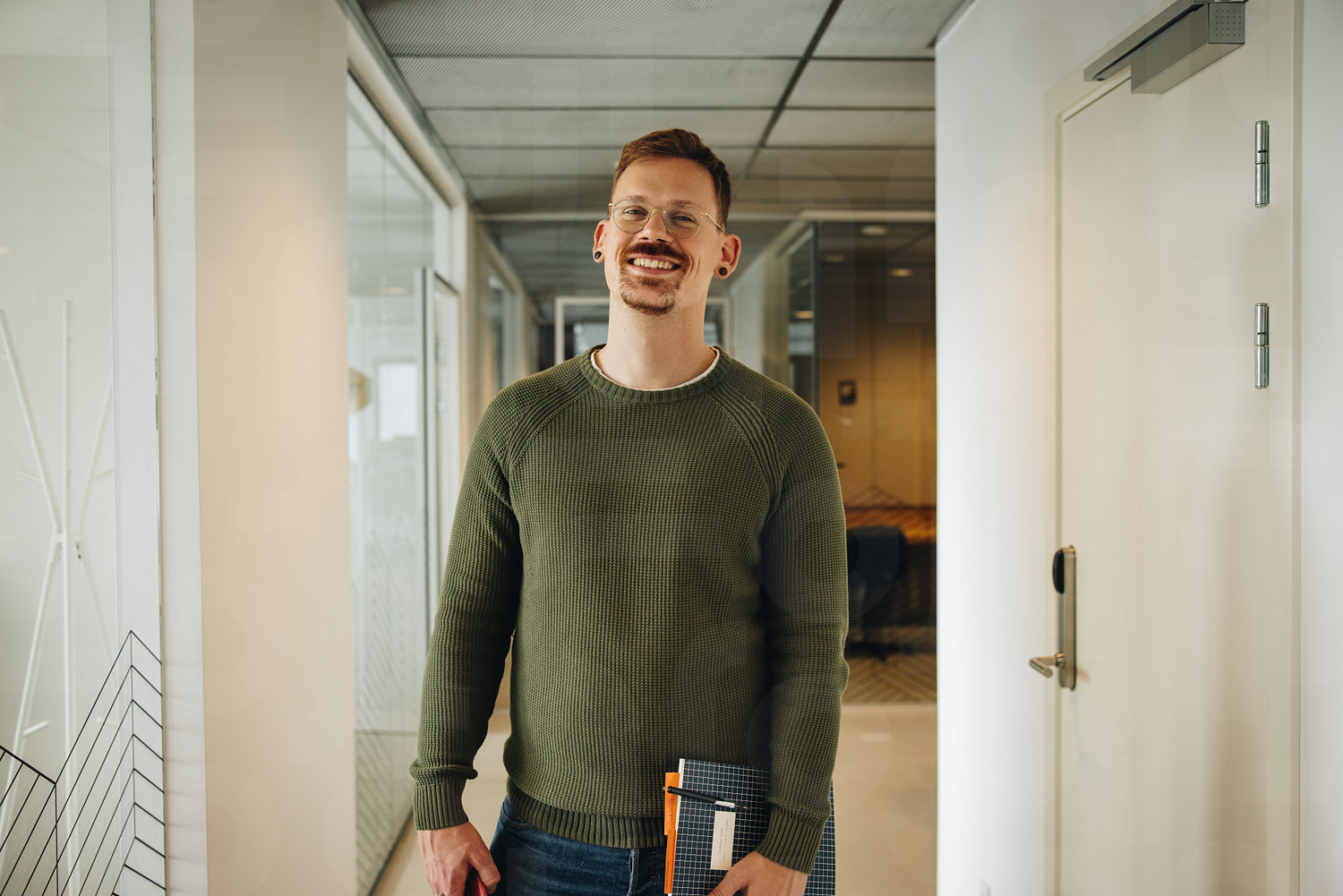Positive male executive in office. Portrait of a businessman in office corridor.