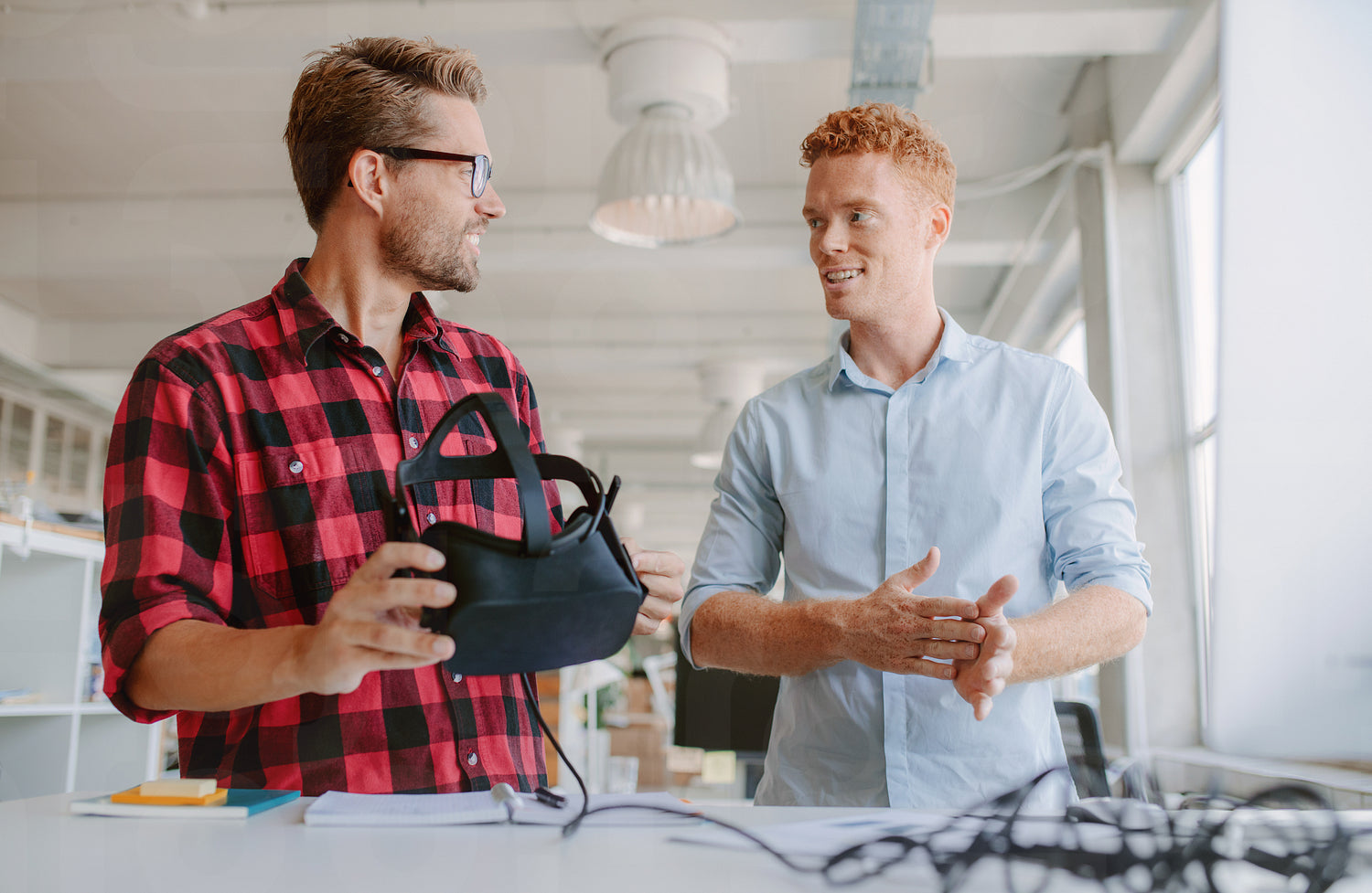 Shot of two young developers discussing on new virtual reality glasses. Business colleagues working on developing new VR goggles technology in modern office.