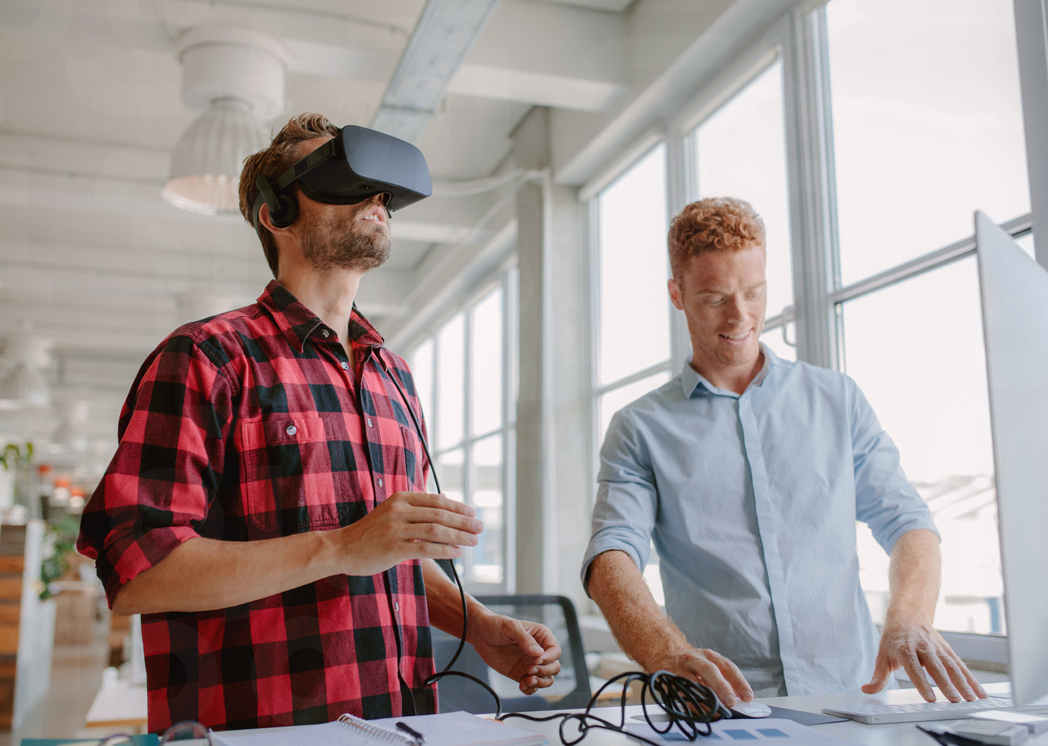 Young developer working on laptop and virtual reality glasses. Two men improving virtual reality glasses in office.