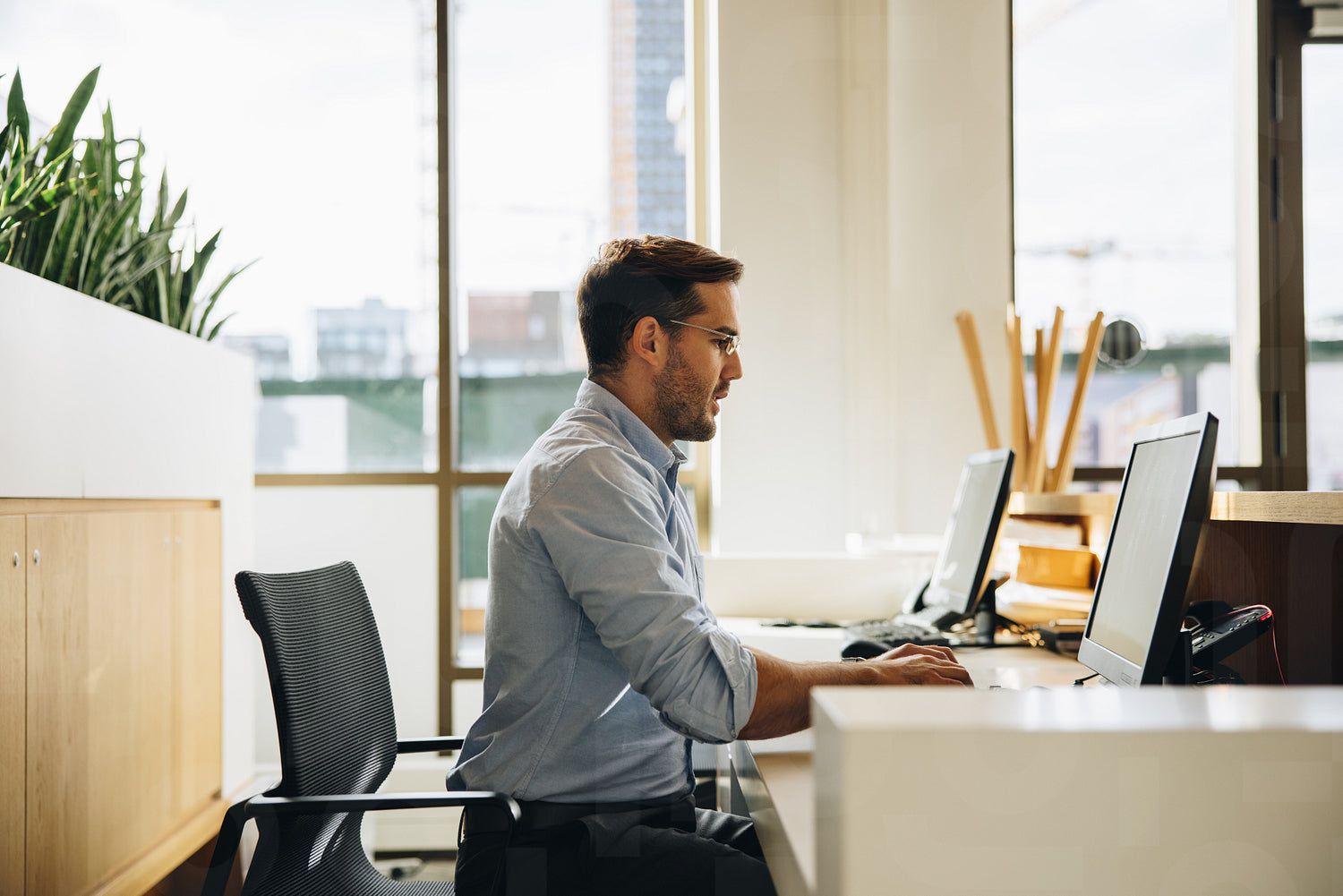 Side view of young executive working on computer in office. Businessman working in office on computer.