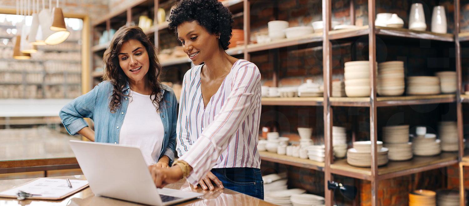 Young female ceramists using a laptop together in their store