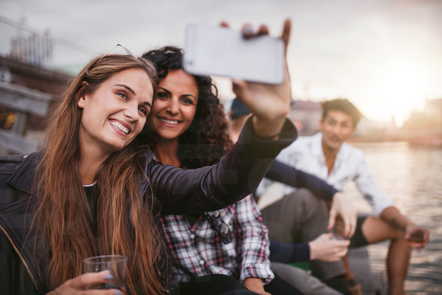 Shot of young female friends taking selfie with mobile phone with male friends sitting in background. Group of people enjoying a day by the lake.