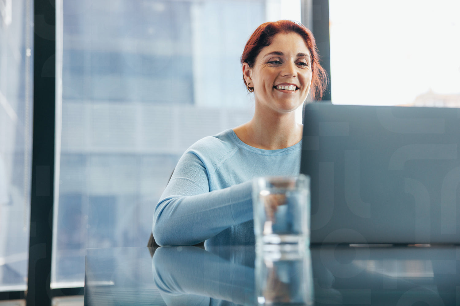 Happy and young female professional participates in an online business meeting, contributing her insights to the conversation. Business woman using a laptop to communicate with her remote team.