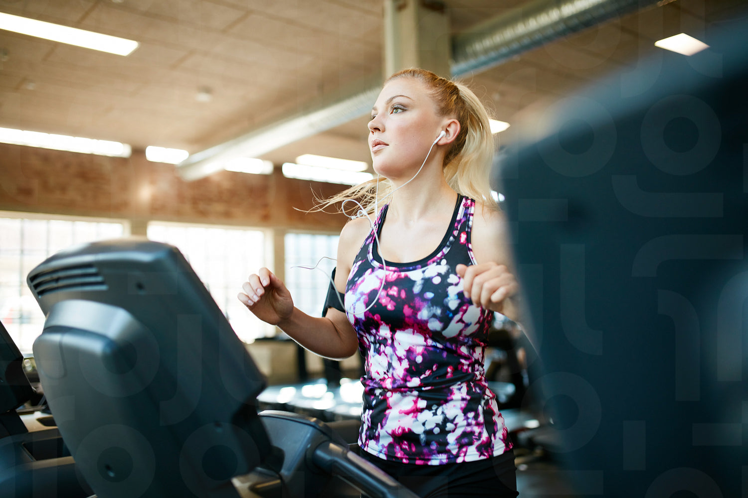 Shot of a woman running on the treadmill at gym. Young focused female working out at health club, training on exercise equipment.