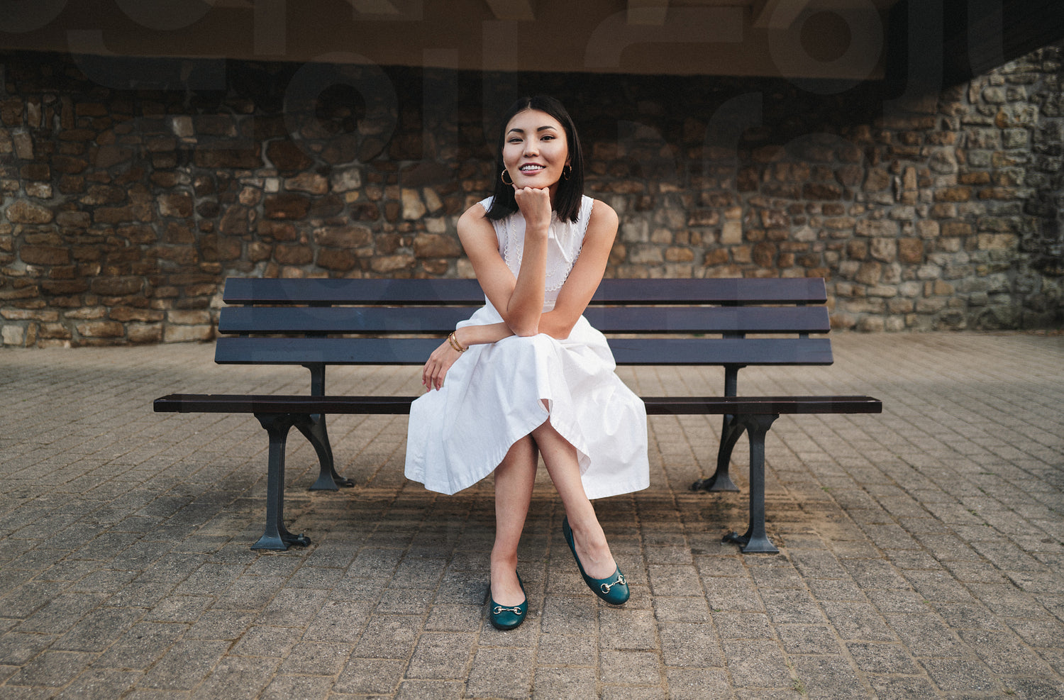 Young female student looking at the camera while sitting on a bench in a white dress. Happy woman relaxing outdoors. This photo has intentional use of 35mm film grain.