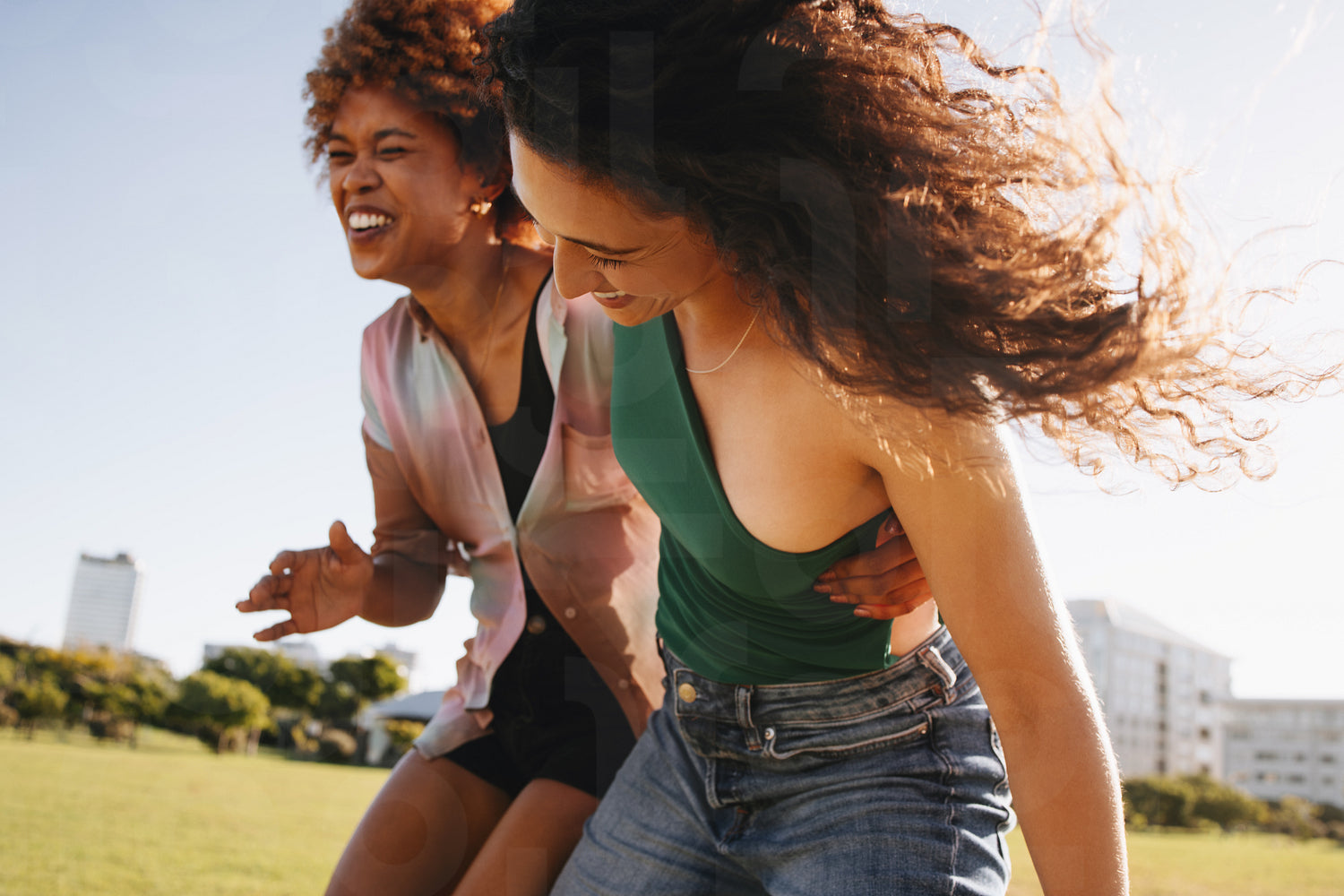 Two young friends in their twenties sharing carefree laughter and joy while playing together in an open green park under the sun.