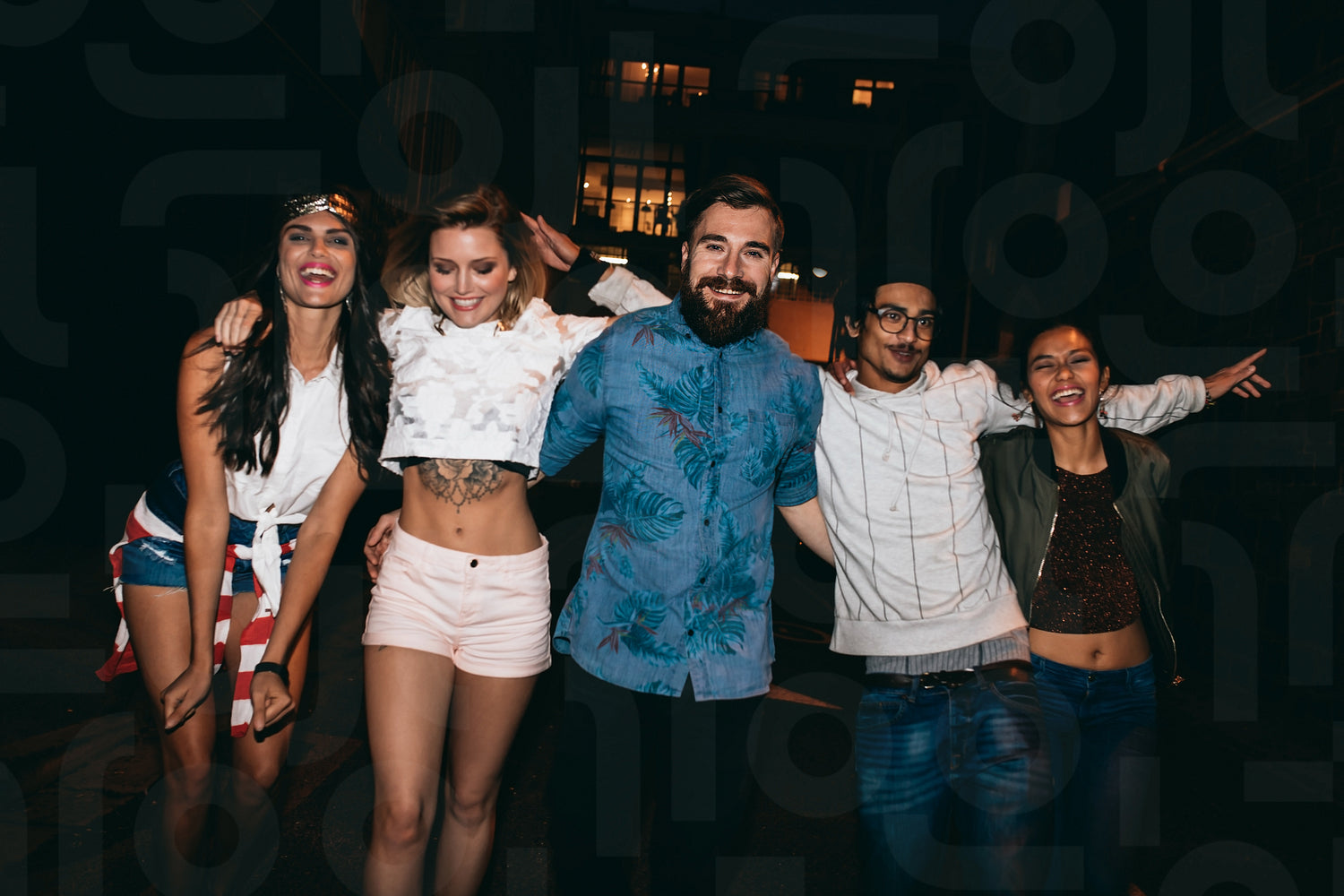 Portrait of group of friends having party together, outdoors. Multiracial young people hanging out in evening.