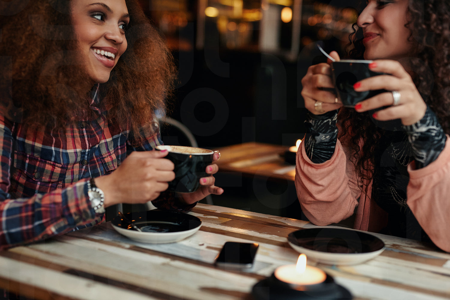Cropped shot of a young friends in a coffee shop. Young women in cafe sitting at table drinking coffee