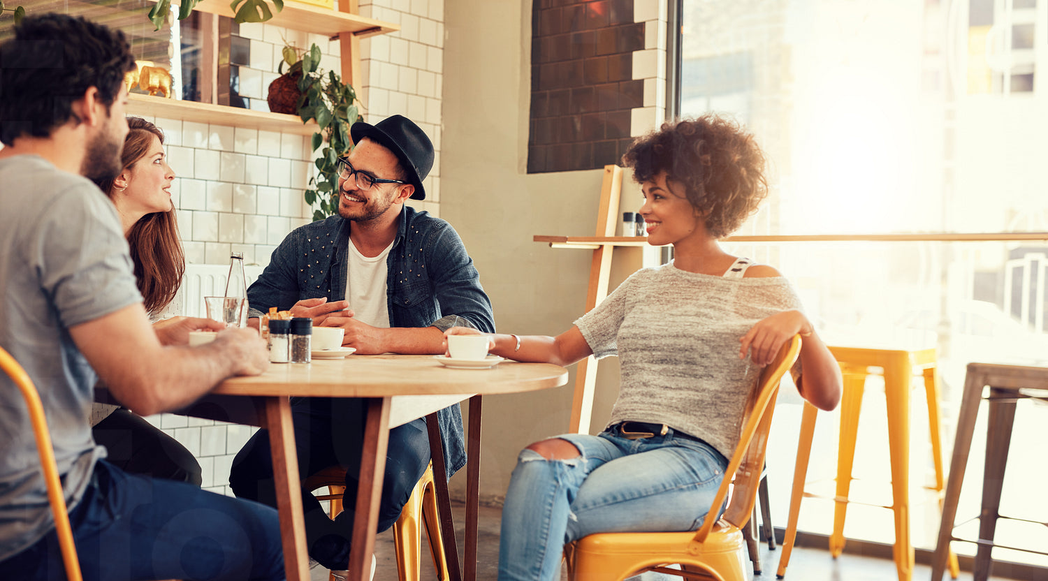 Portrait of a young group of friends meeting in a cafe. Young men and women sitting at cafe table and talking.