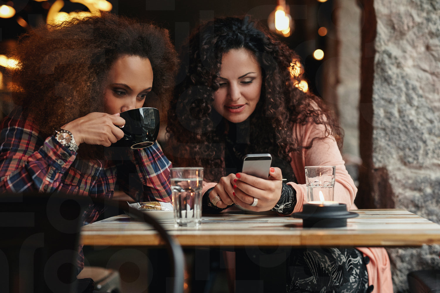 Young friends sitting in a cafe looking at a smartphone. One woman drinking coffee and another holding mobile phone,