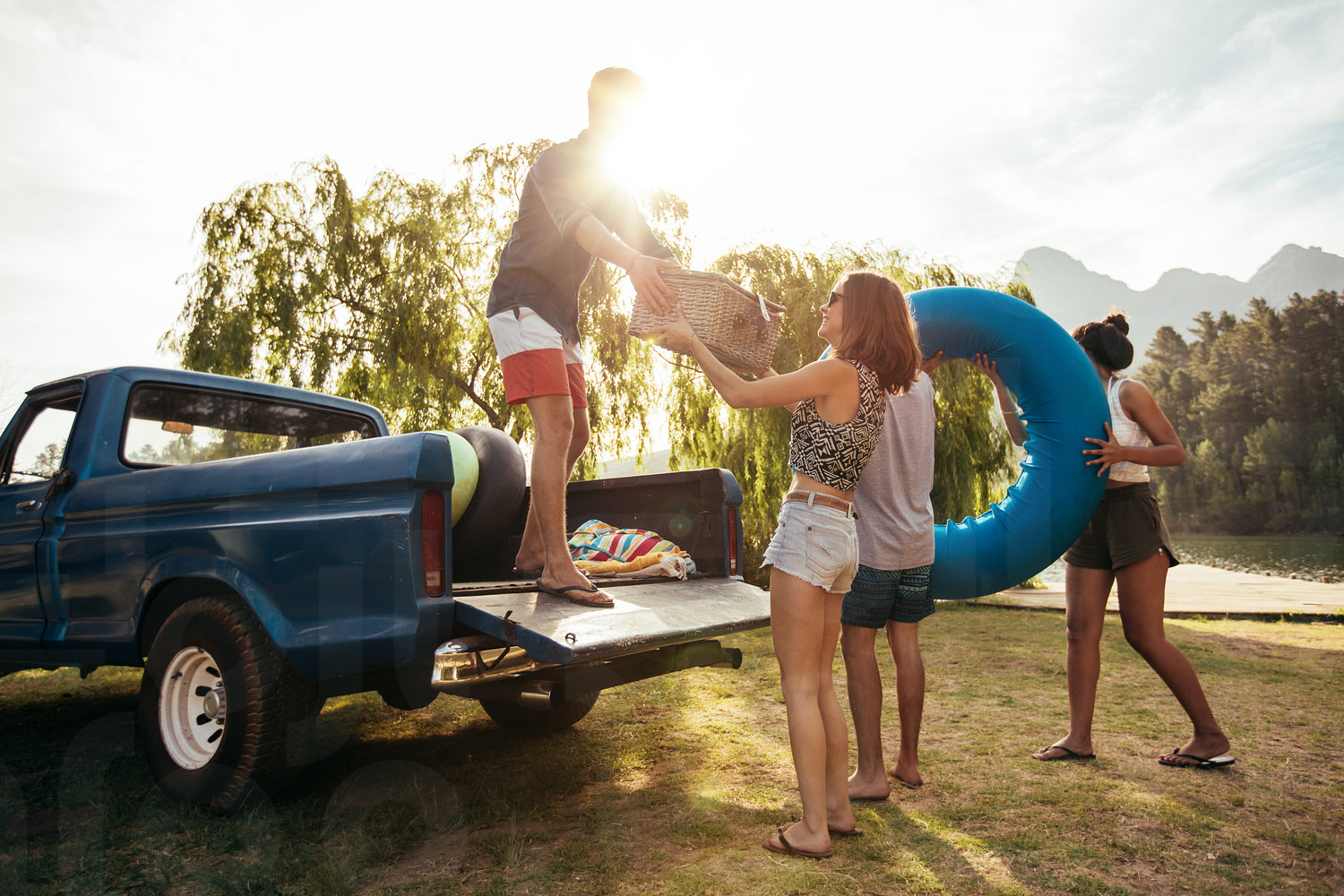 Group of young friends on picnic by the lake. Men and women unloading pickup truck on camping trip, carrying picnic basket and inflatable tube on sunny day.